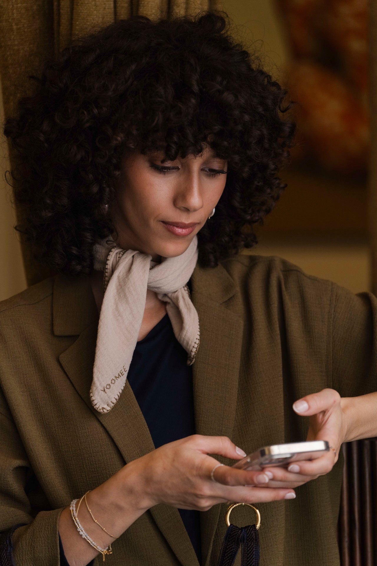 each piece is carefully hand-embroidered all around using the traditional "hbik" technique. just the finishing alone takes about two hours of skilled work, lovingly done by our dear AZIZA. we named the foulard after her – AZIZA, meaningthe beloved one. It felt just right.