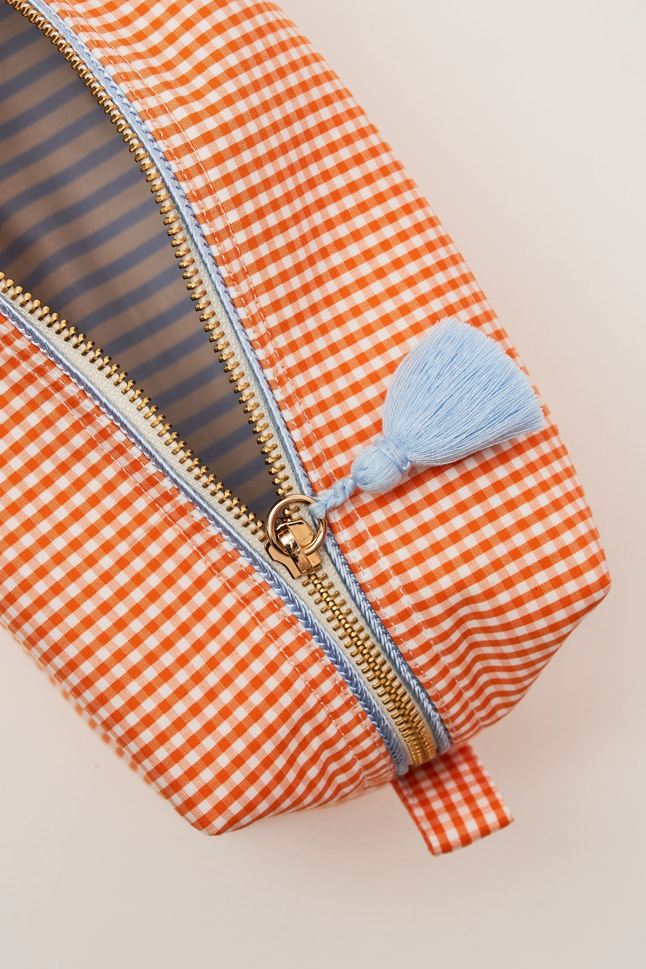this colorful necessaire is perfectly sized for all your bathroom essentials. it features unique cotton fabrics, a hand-embroidered logo and an intricate border along the zipper. it also has a cute little tassel on the zipper.