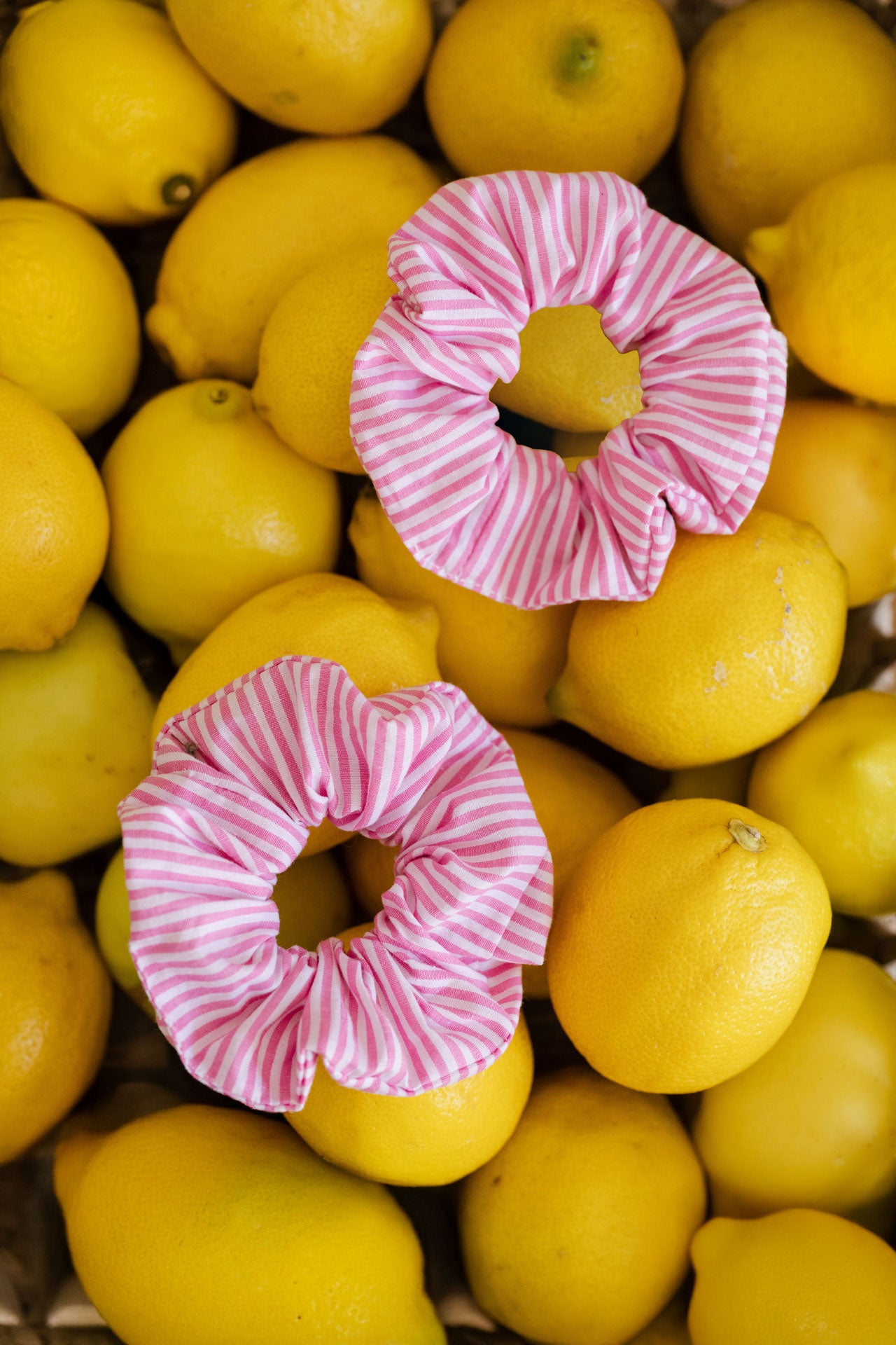 this scrunchie is crafted from leftover cotton. the nice fabrics is not only gentle for your hair, it also adds a playful touch to your look.