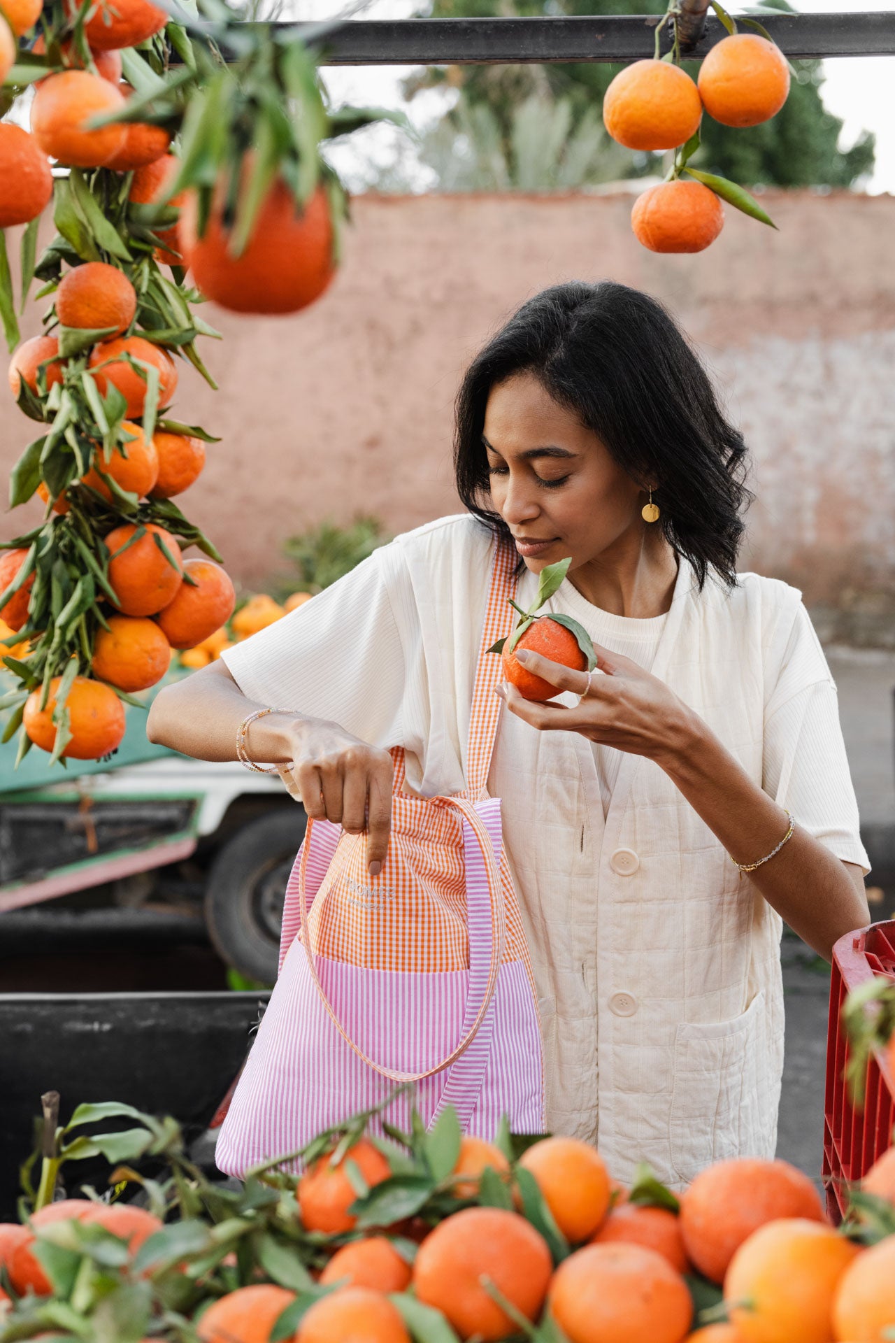 this colorful tote bag is perfectly sized for all your daily essentials. it features unique cotton fabrics and a hand-embroidered logo. It has two pockets on the outside and a pocket with a sweet little tassel on the zipper inside.