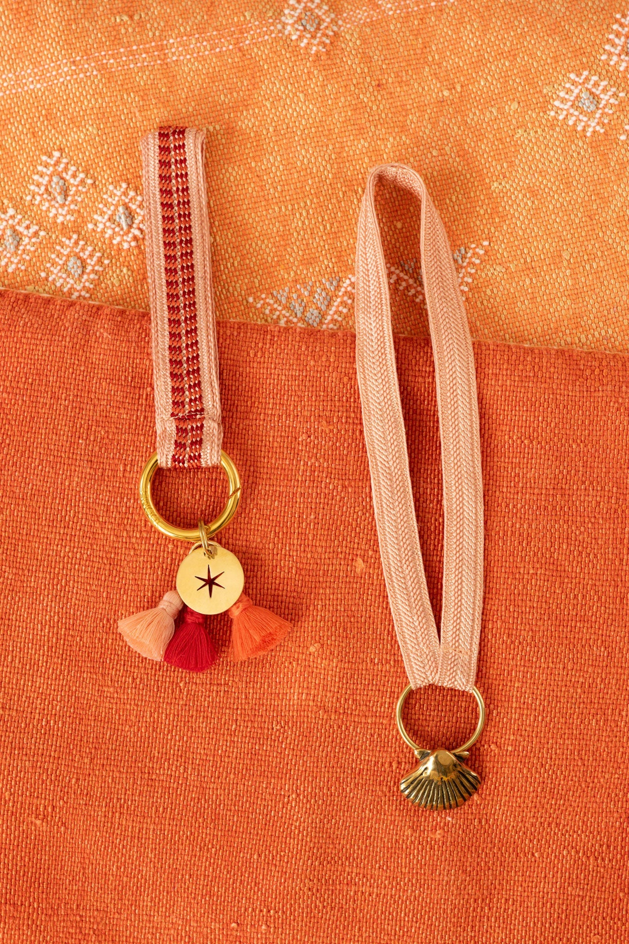 this keychain loop is made from a moroccan ribbon called sfifa, which is traditionally used to decorate elegant kaftans. the process begins with sabra threads, which are braided into sfifa on the outskirts of marrakech using an antique machine. step by step, the threads are transformed into this unique keychain.