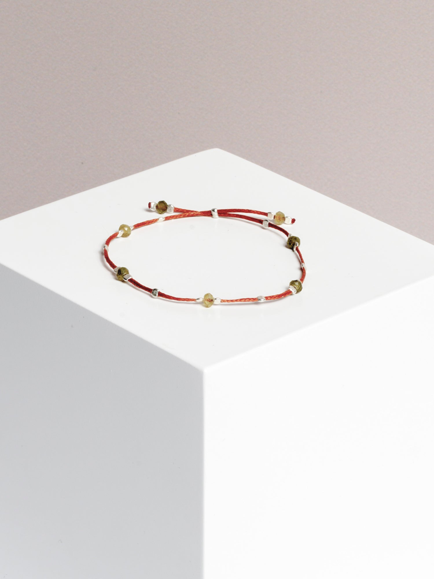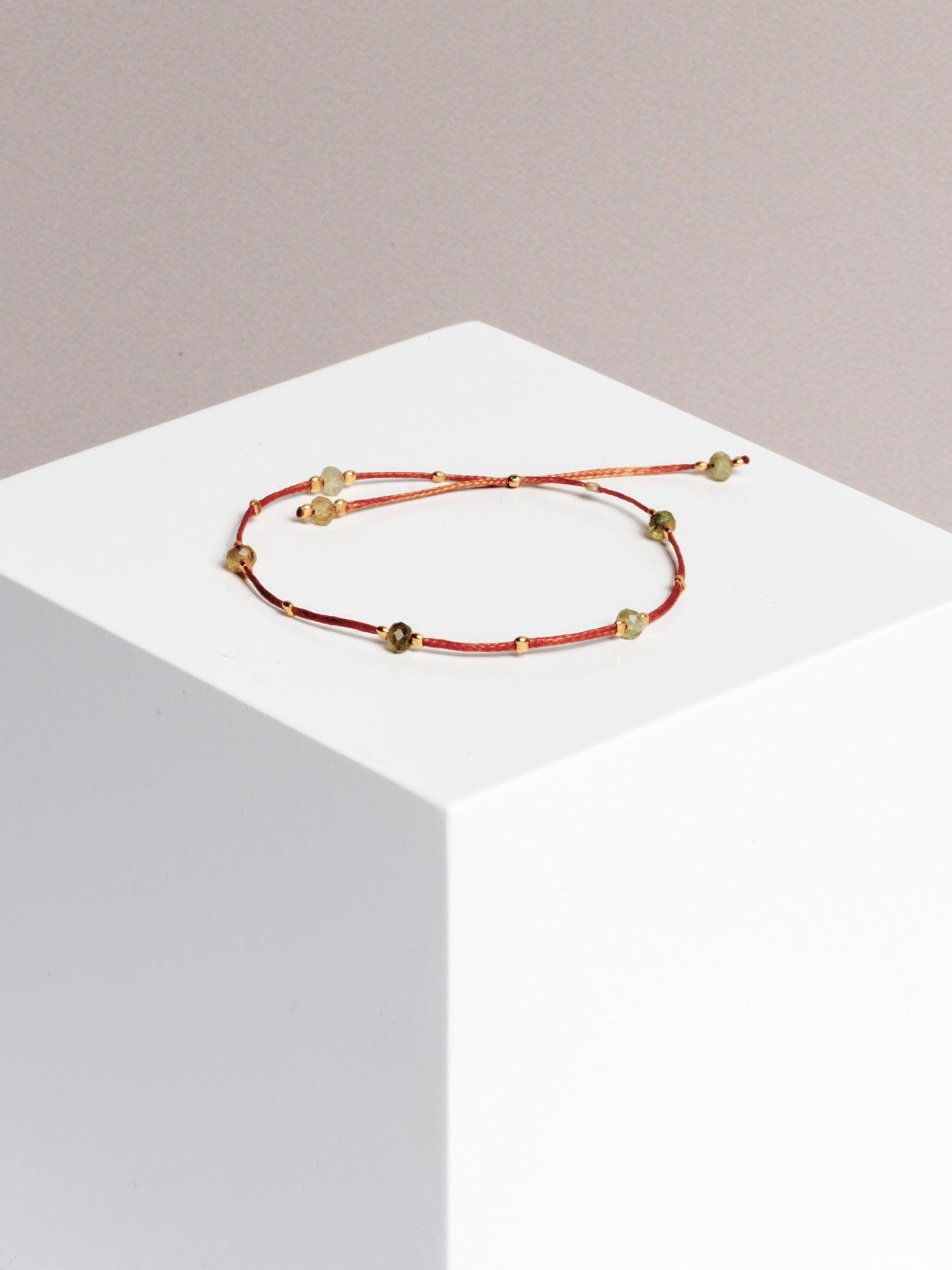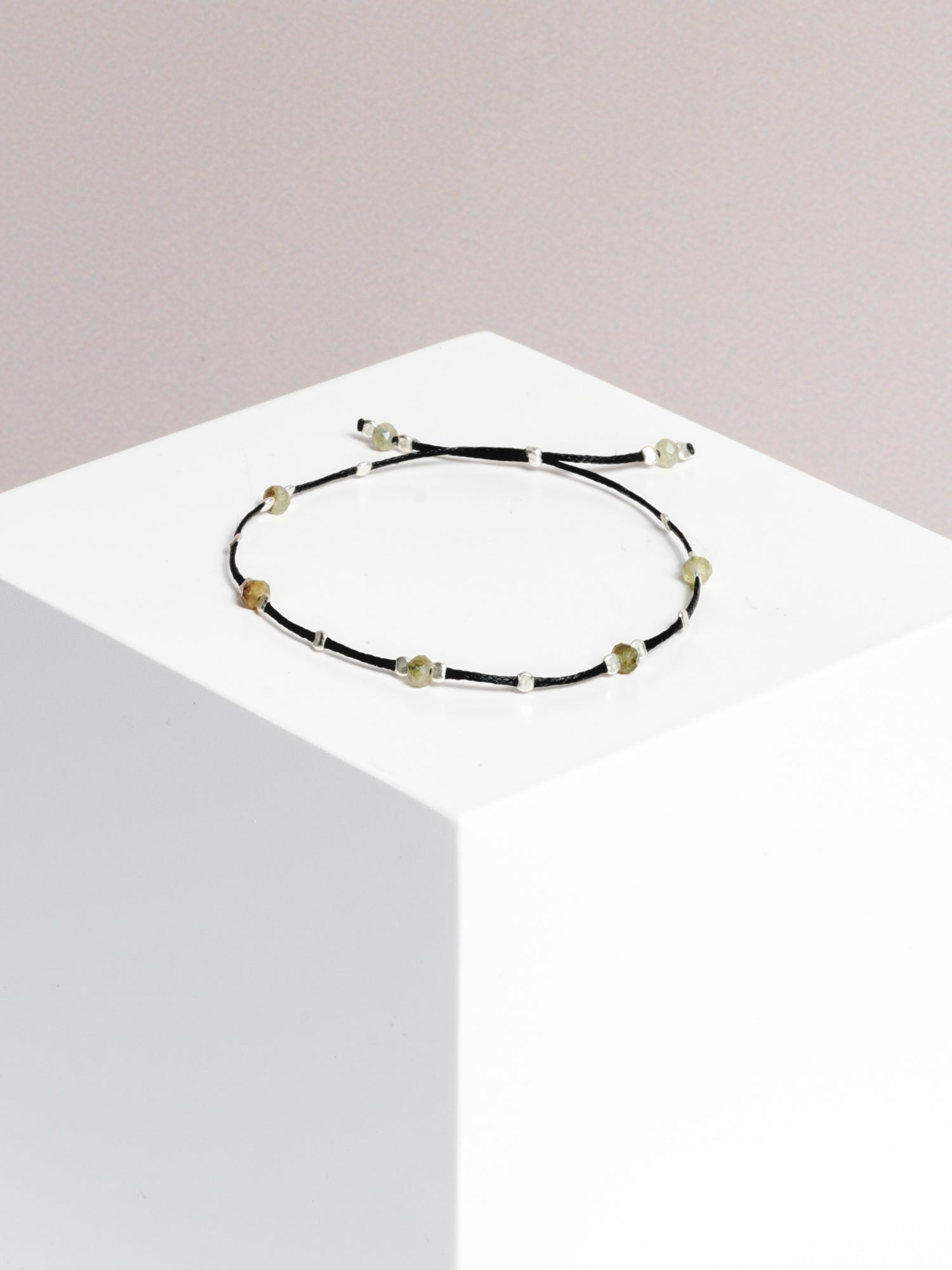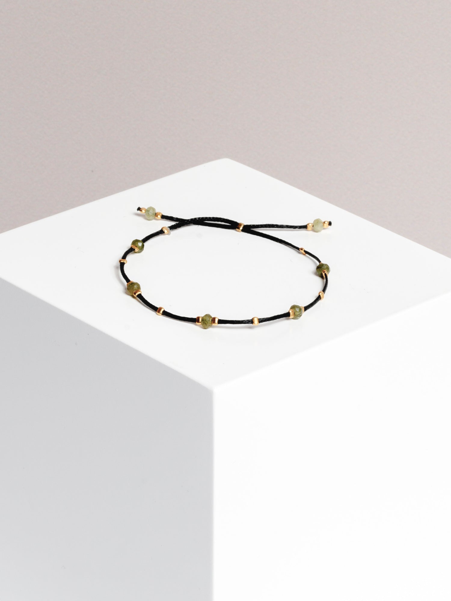 material: waxed thread, green garnet (green stone), gold plated / 925 silver beads