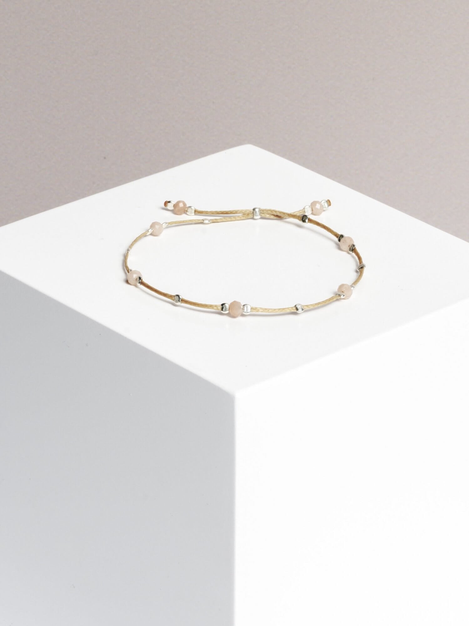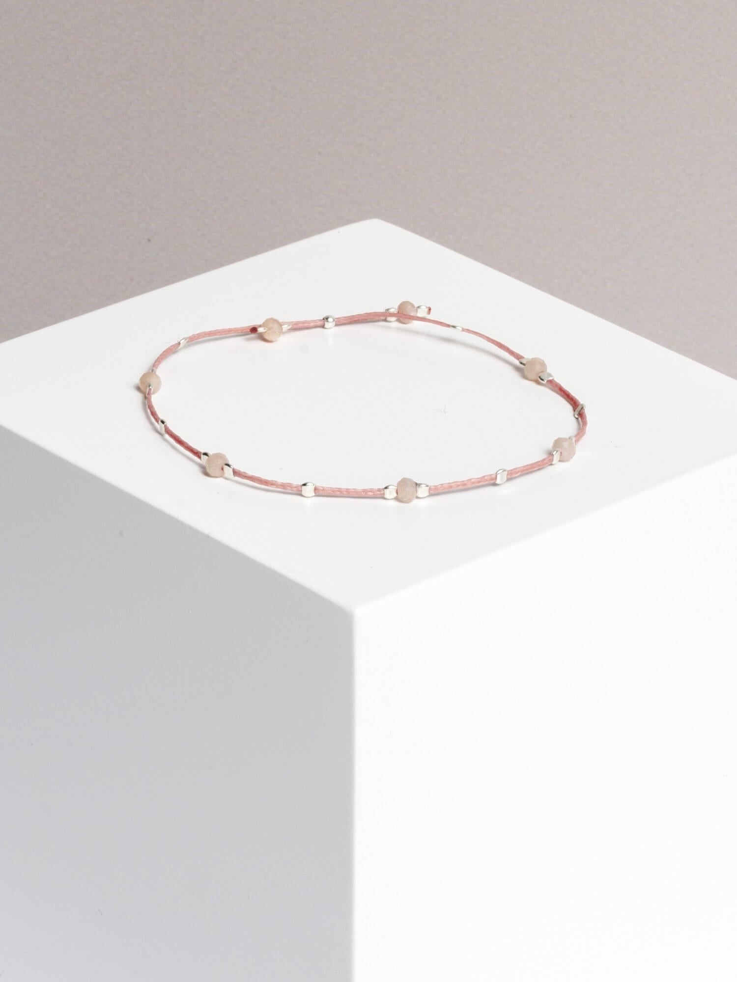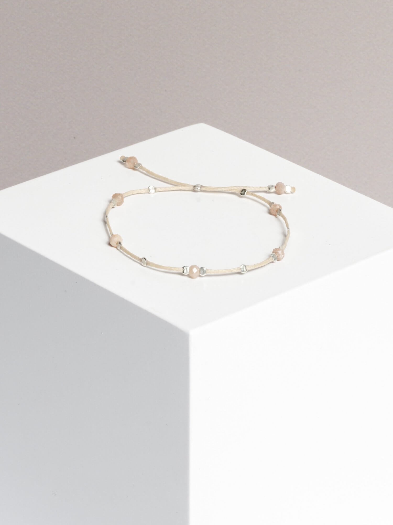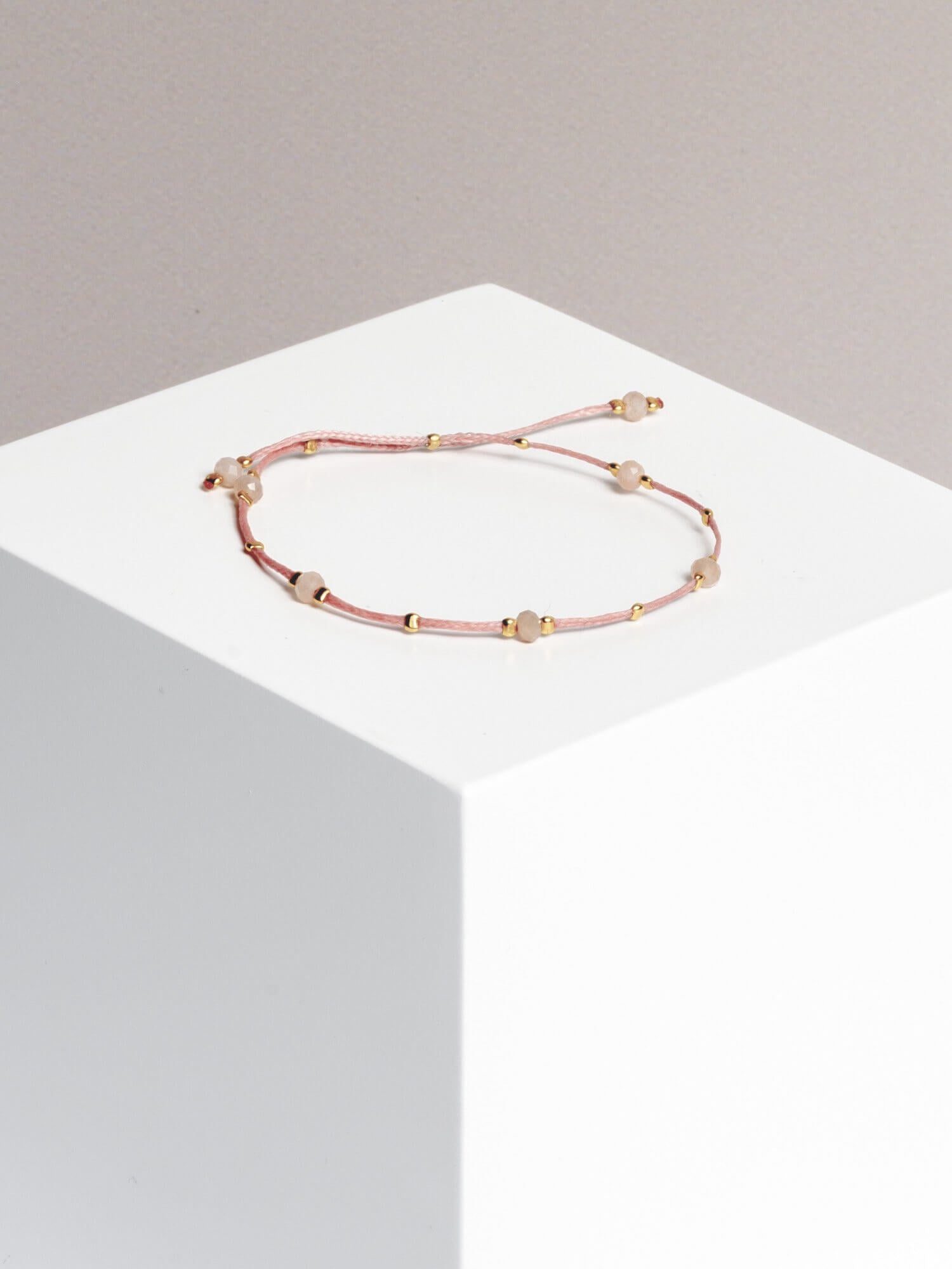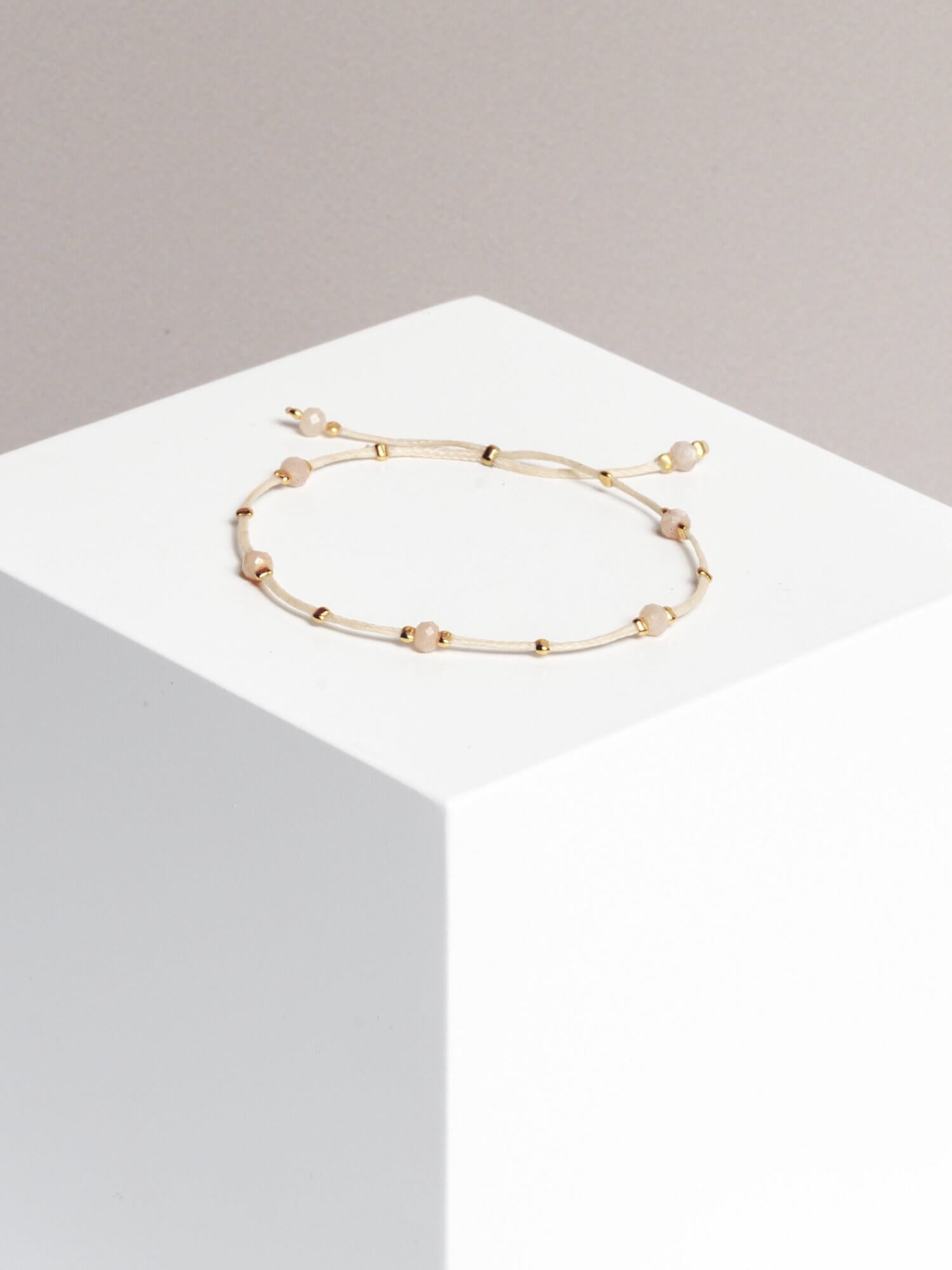 material: waxed thread, peach moonstone gold plated / 925 silver beads