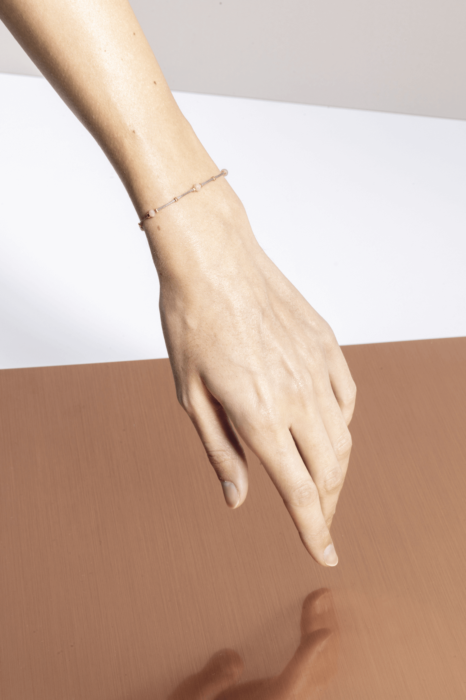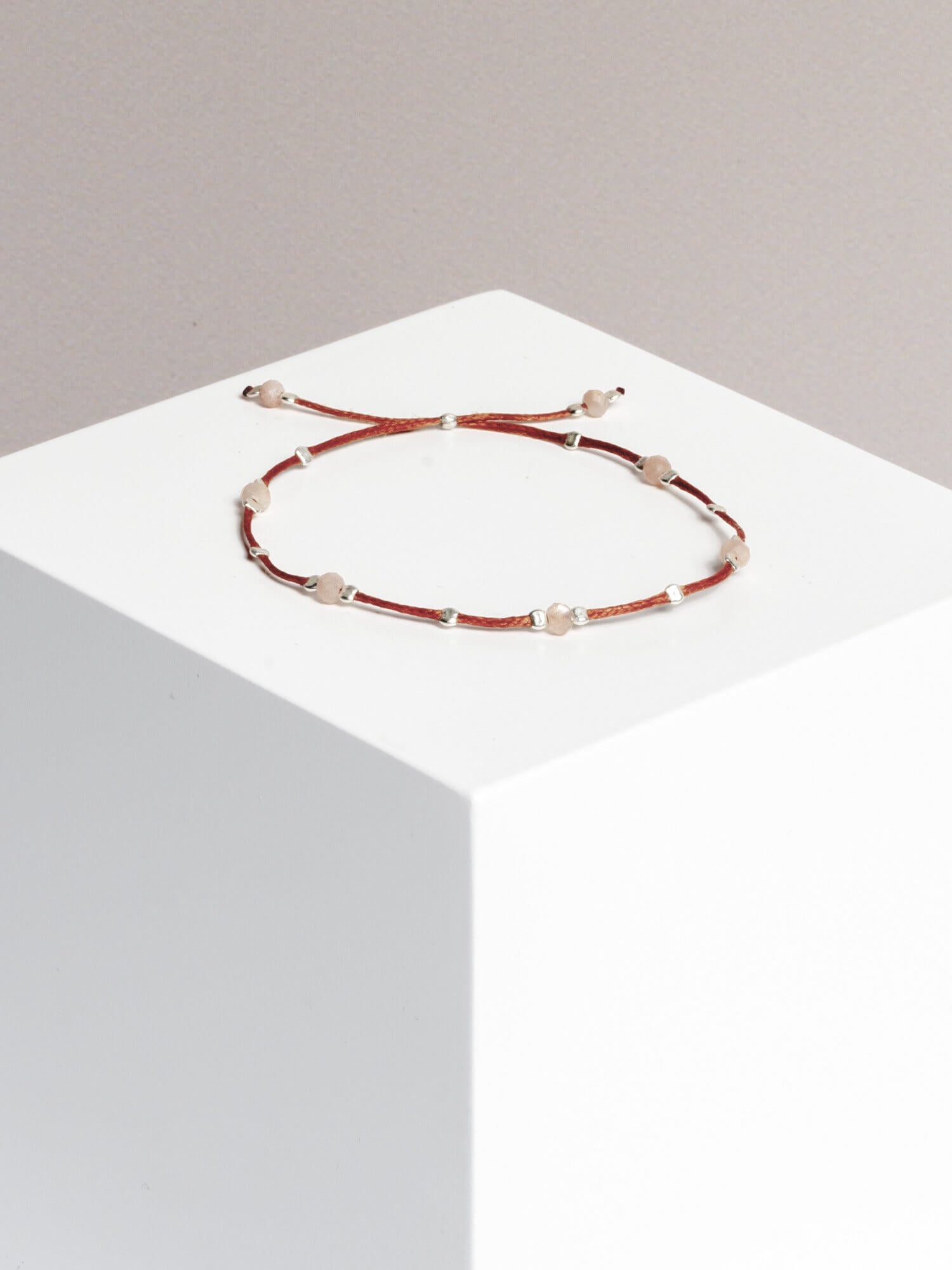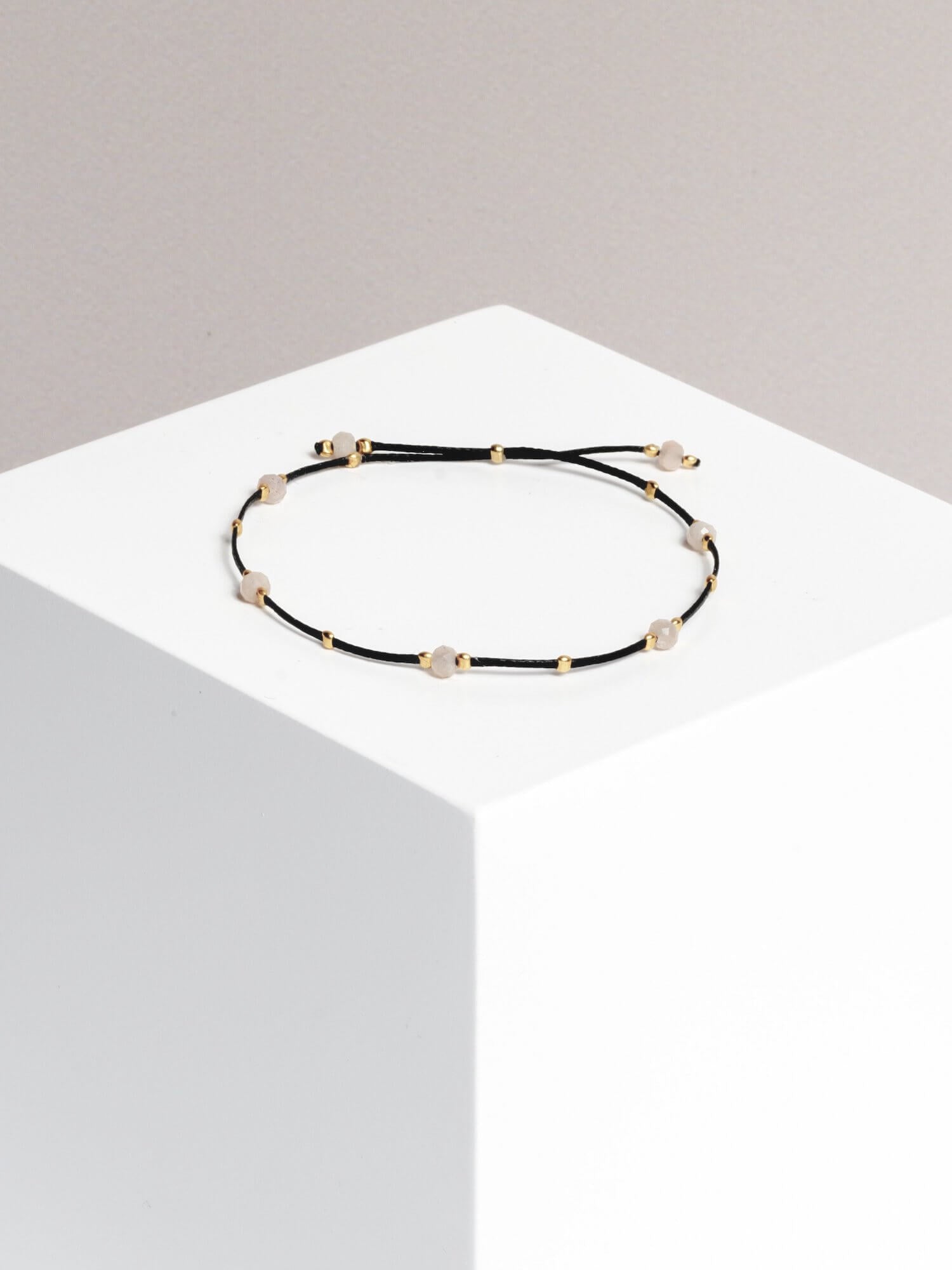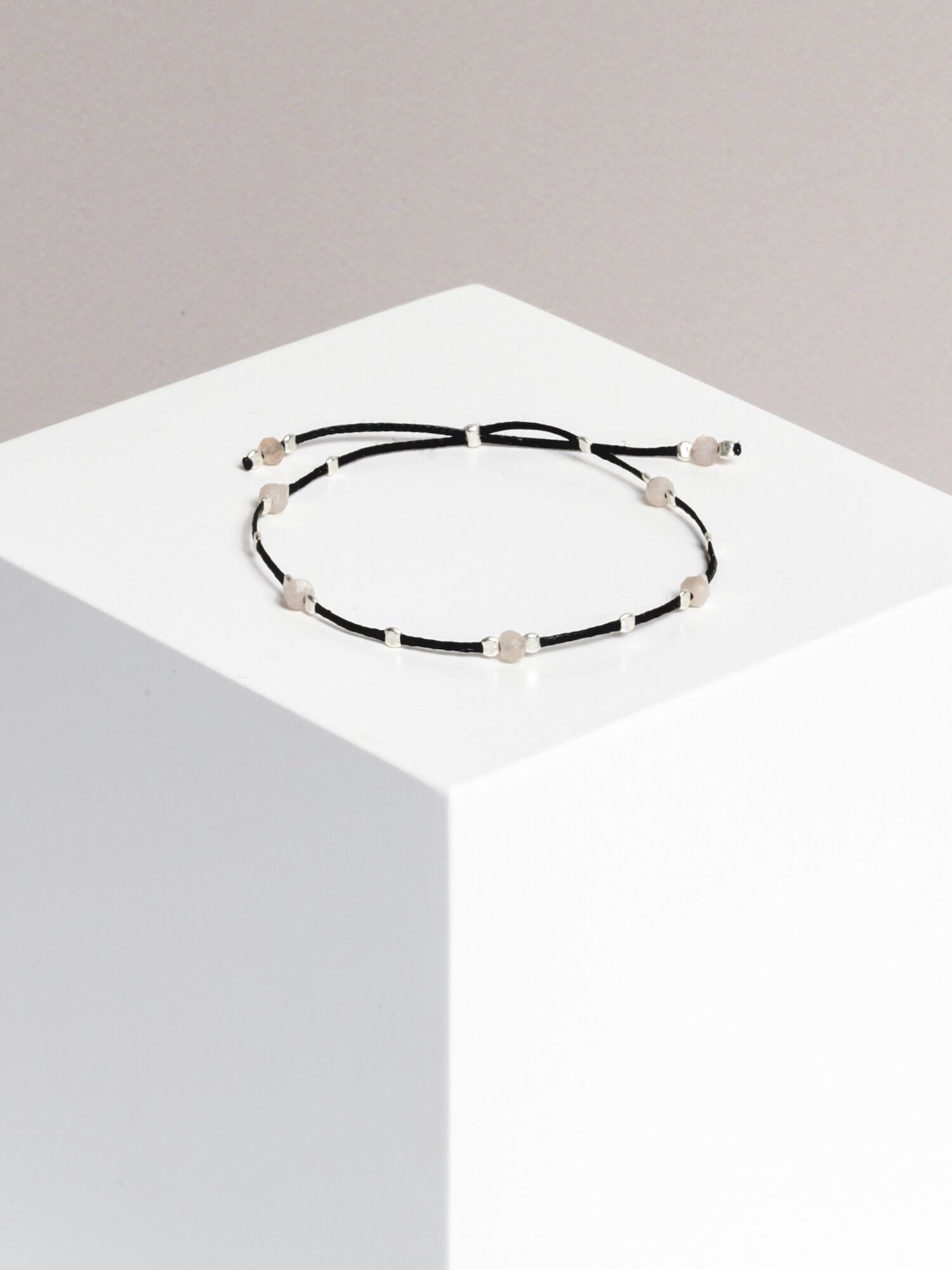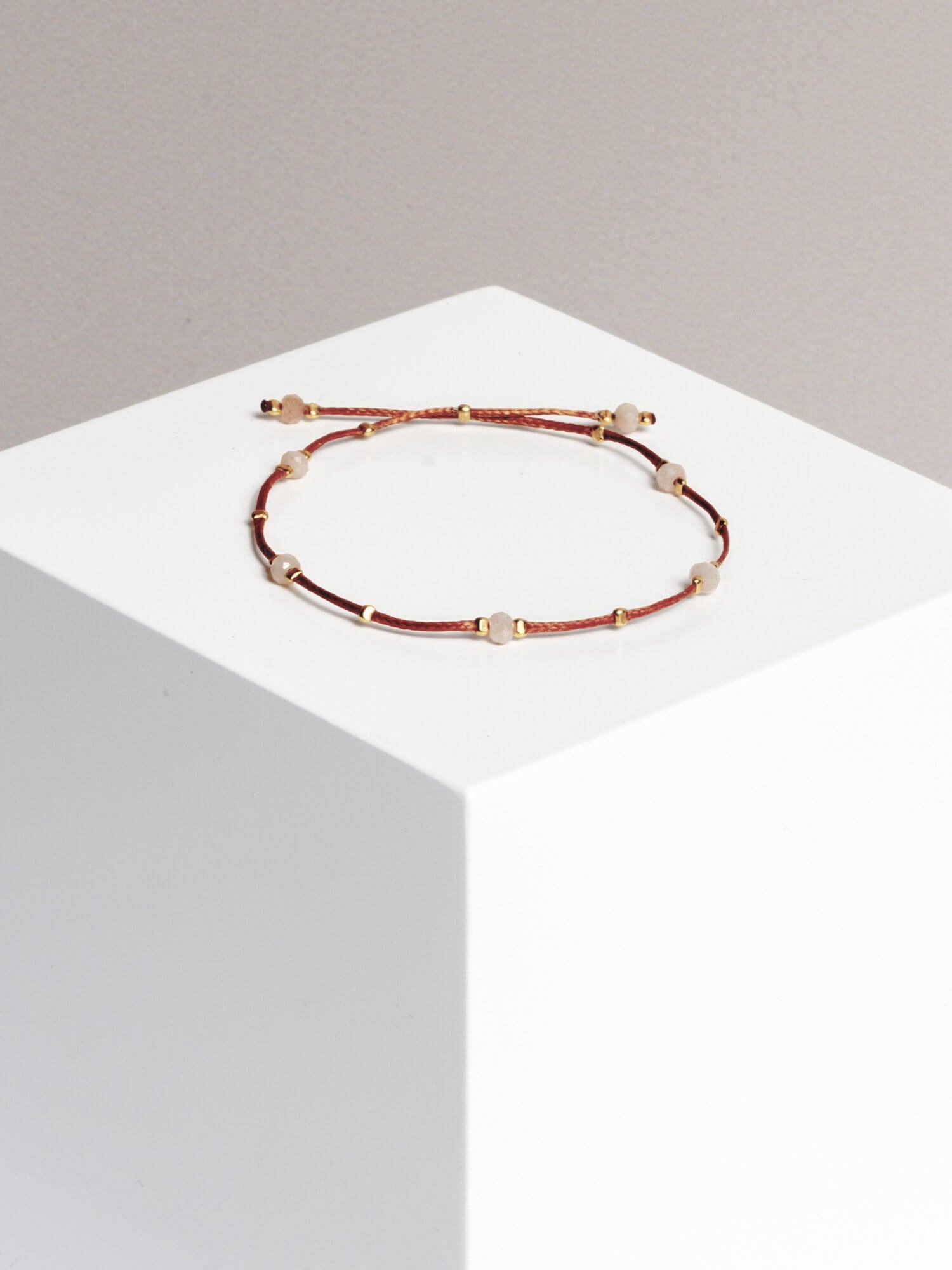 material: waxed thread, peach moonstone gold plated / 925 silver beads