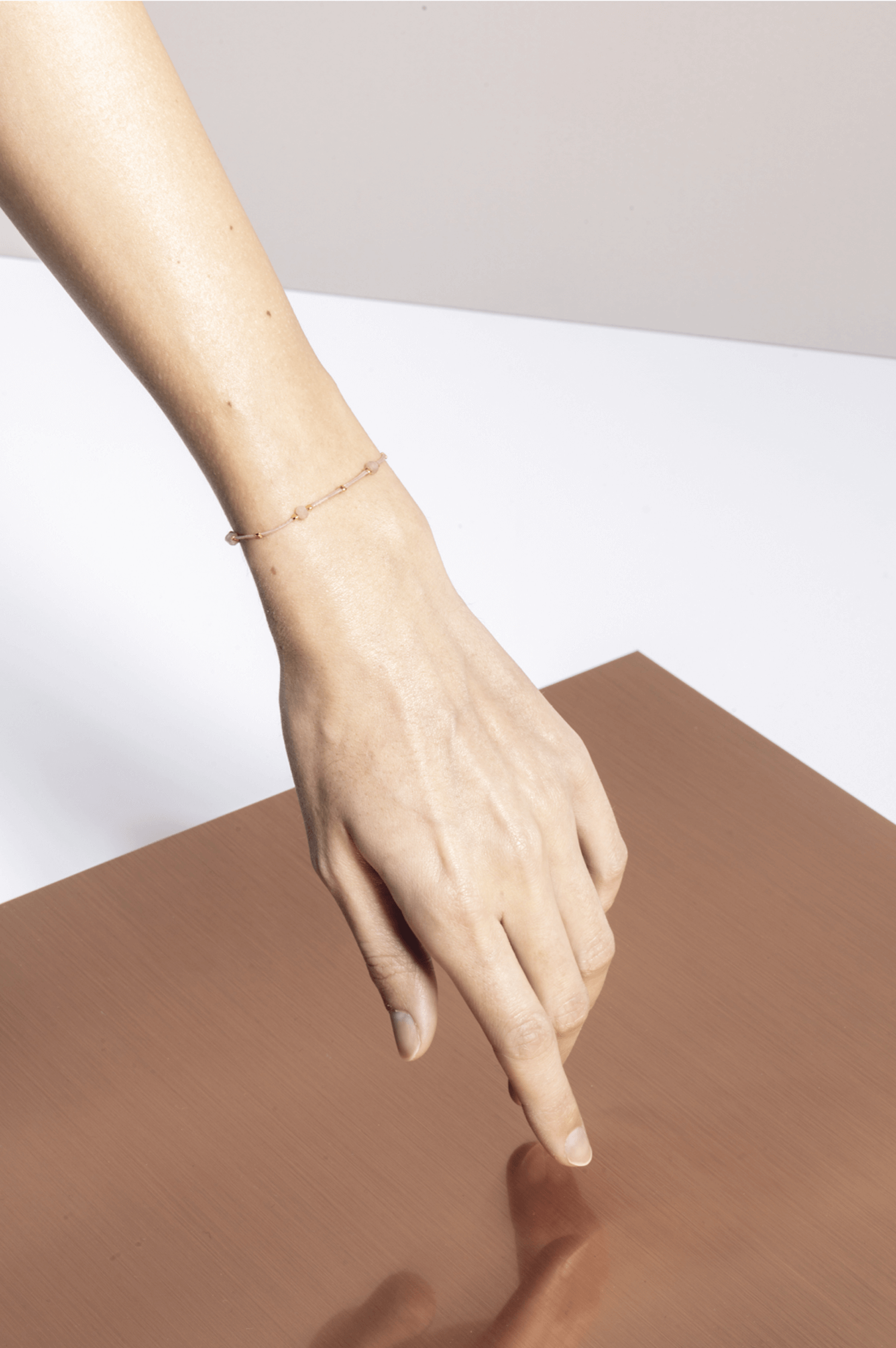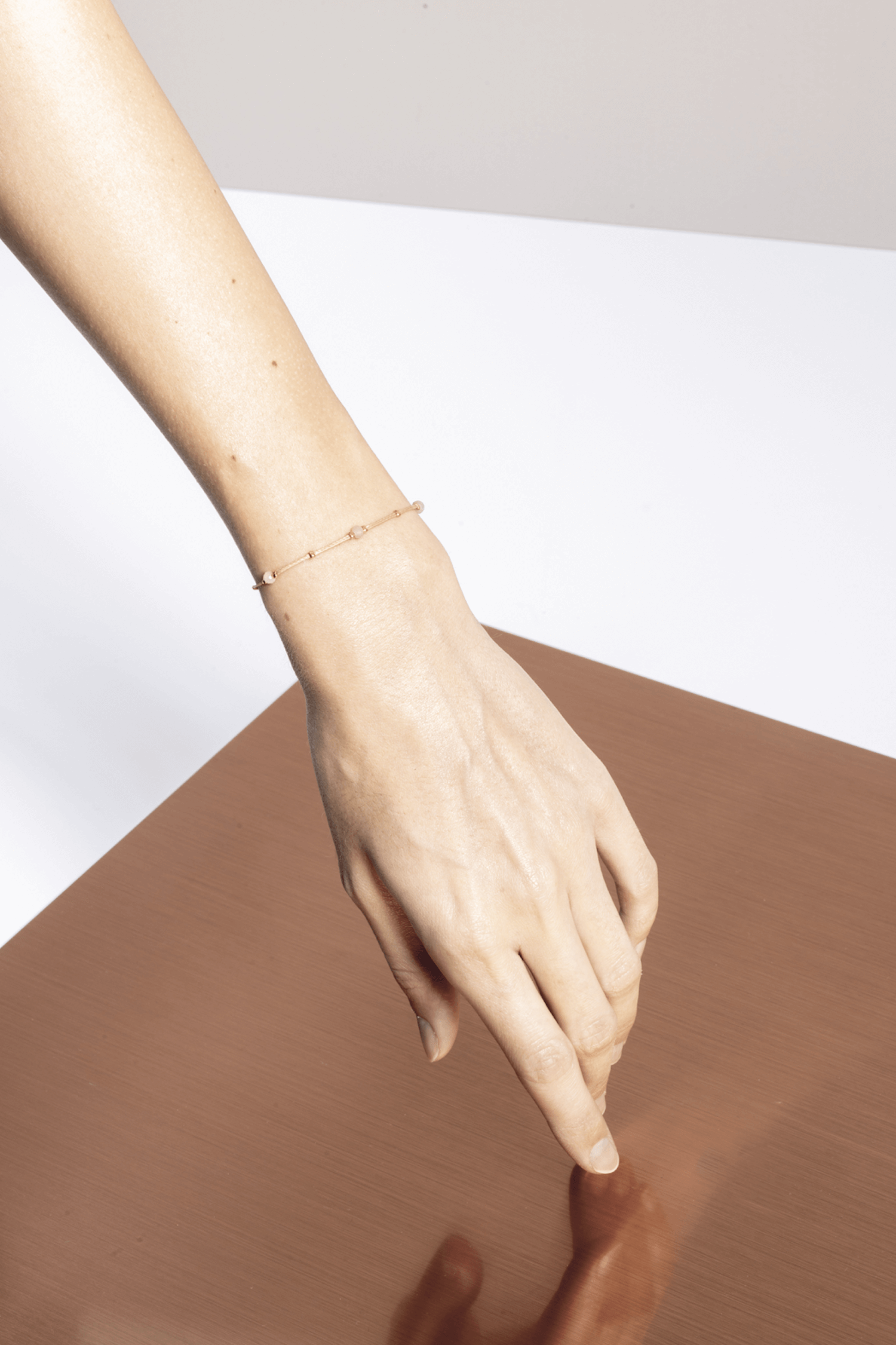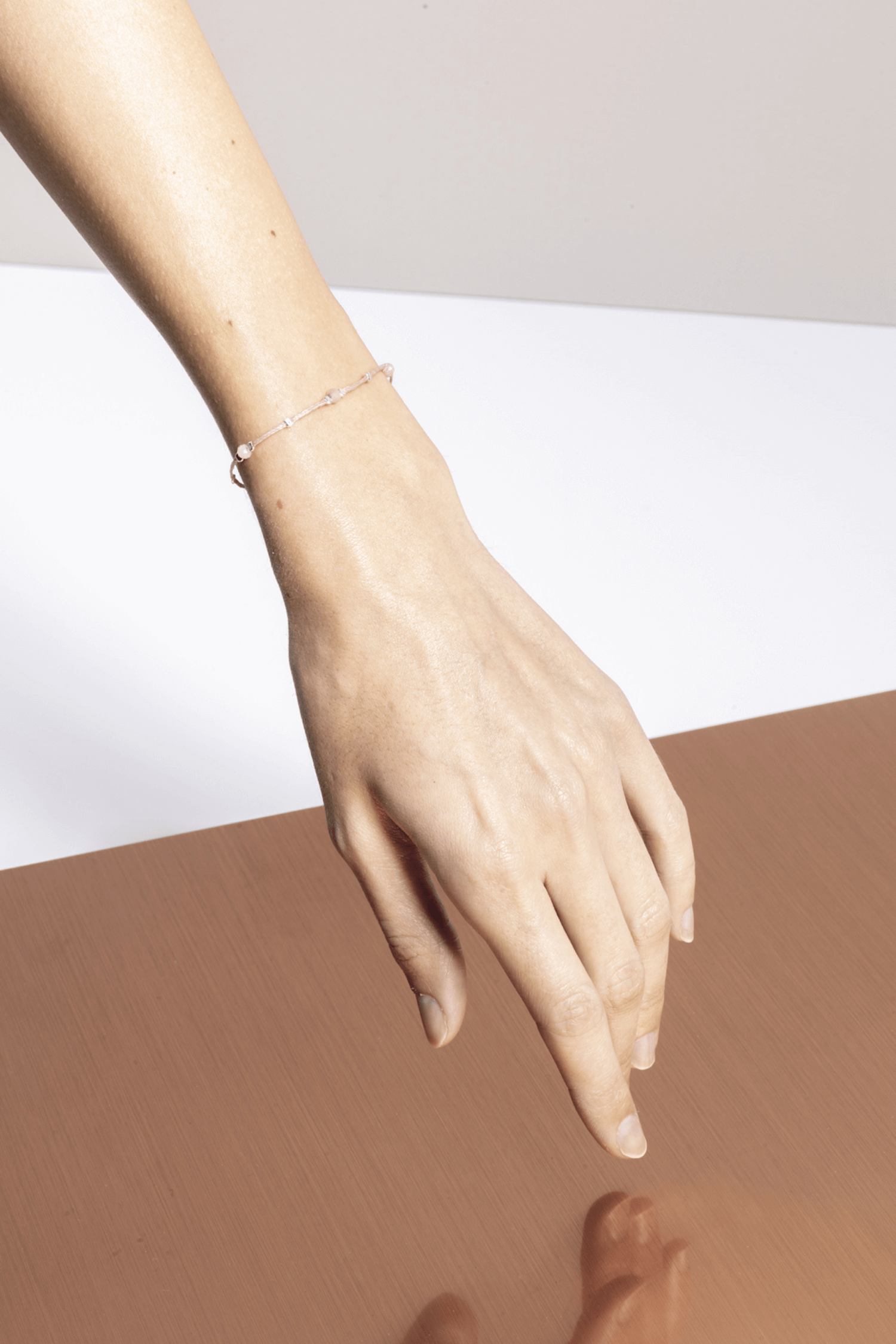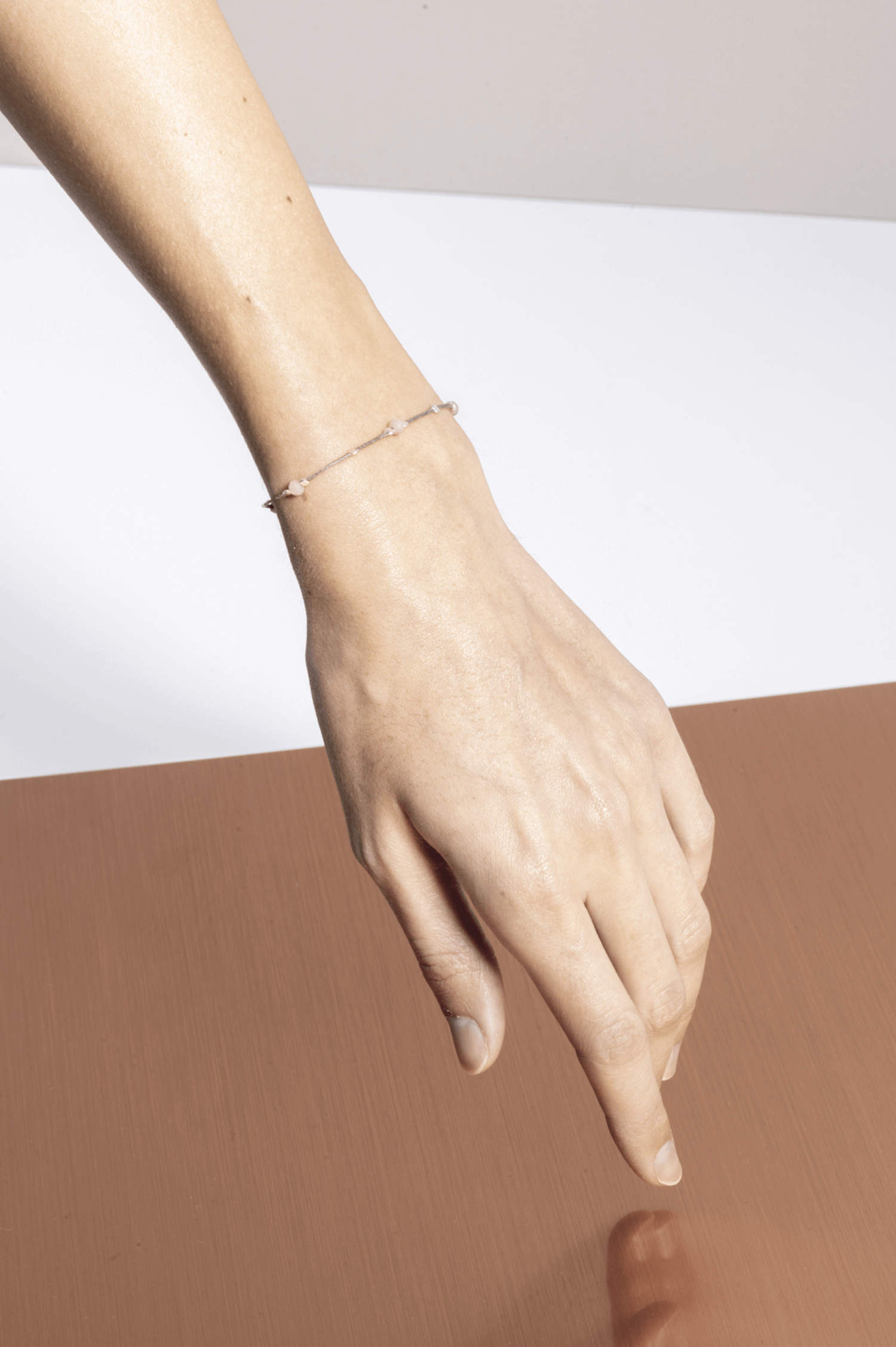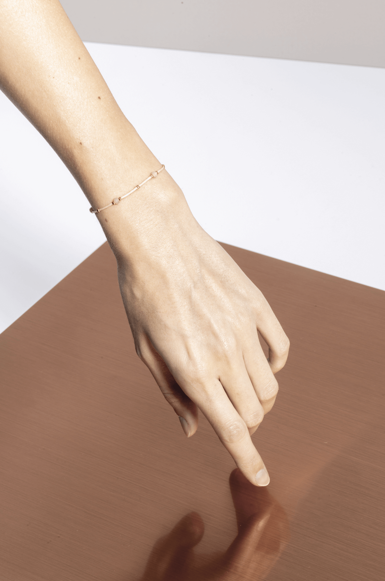 material: waxed thread, peach moonstone gold plated / 925 silver beads