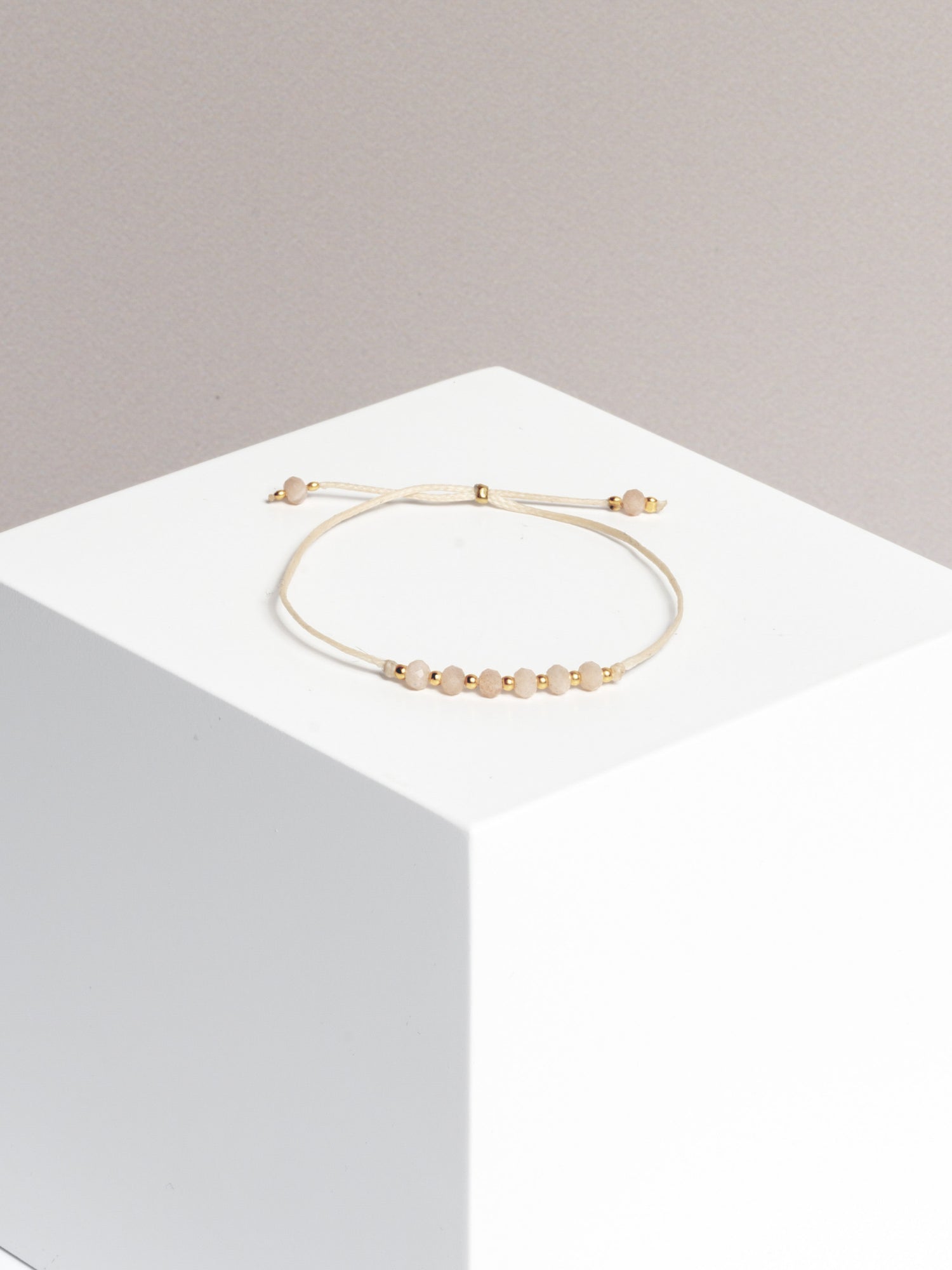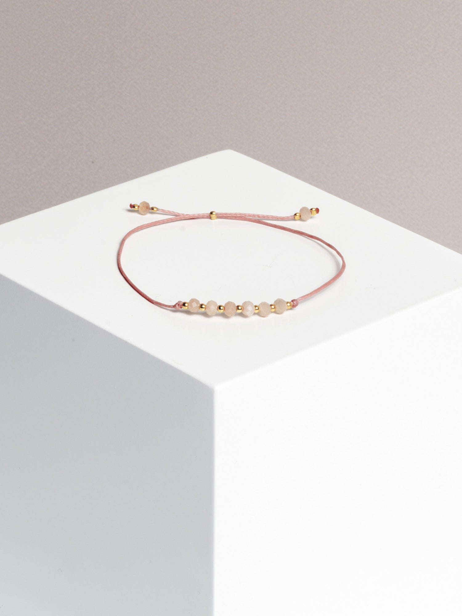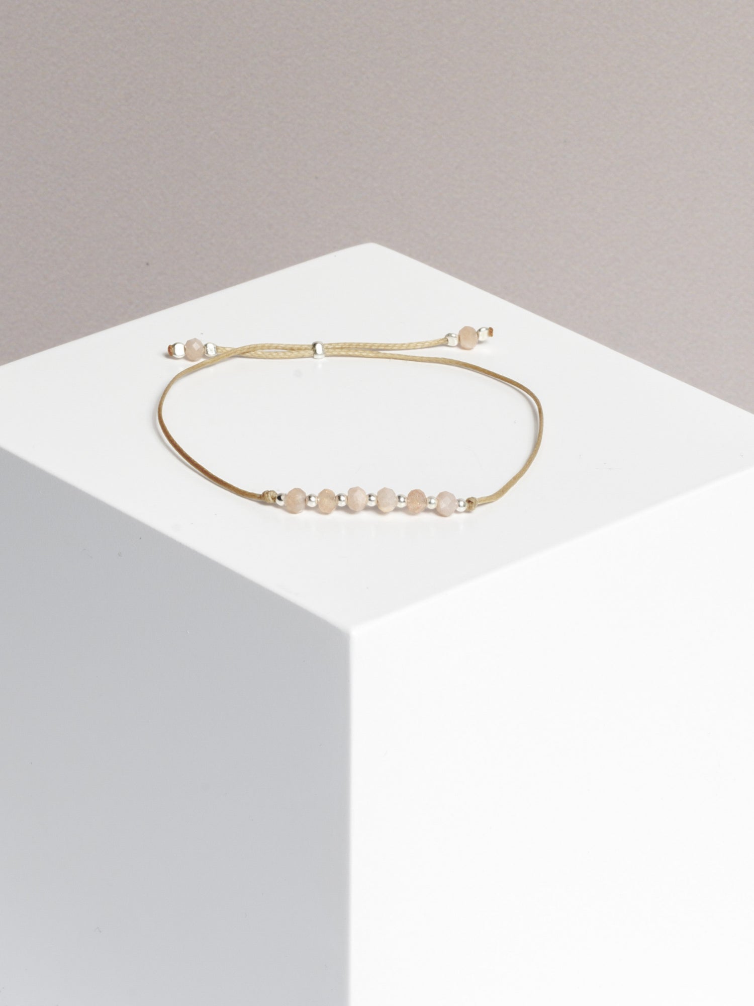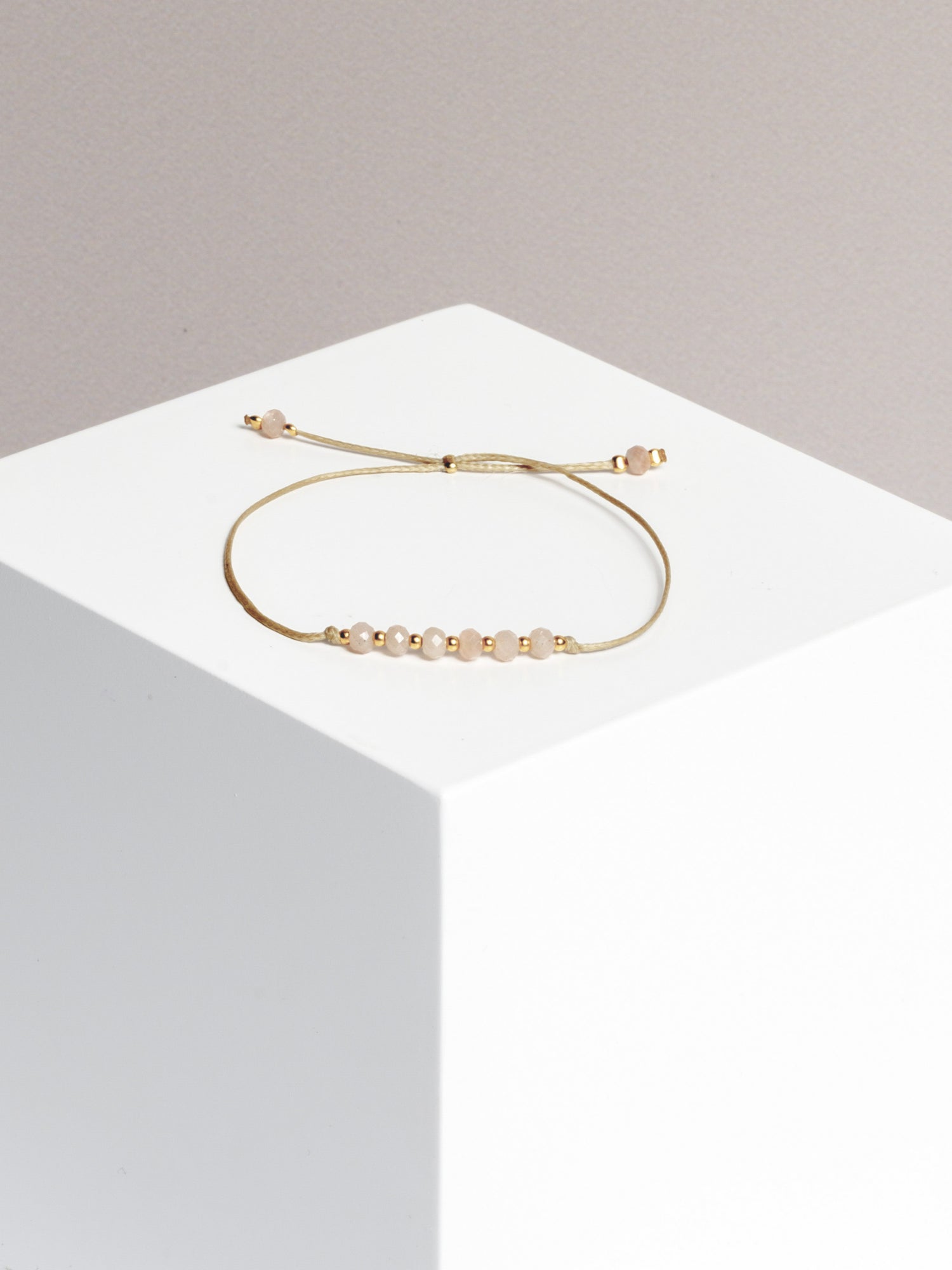 material: waxed thread, peach moonstone, gold plated / 925 silver beads