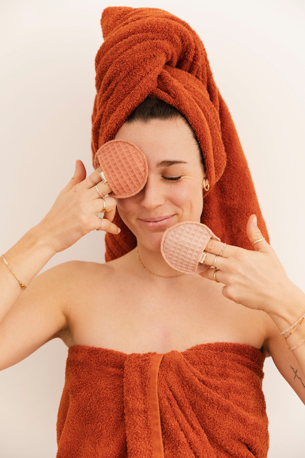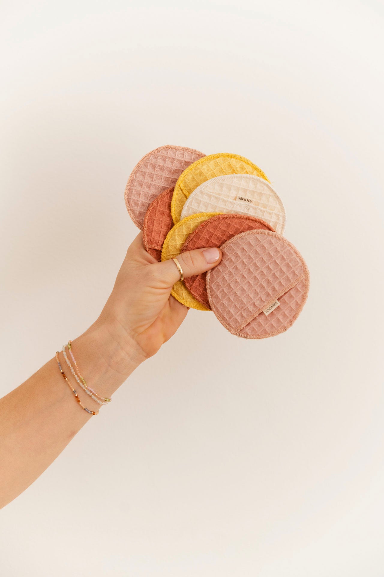 these cleaning pads are made out of soft waffle fabric. this set contains 7 pads, each in a different colour. the convenient opening for your fingers makes daily face cleaning very easy. if you use it with lukewarm water and add soap, it is a very pleasant skin experience. since it is made of 100% cotton, it is no problem to wash the pads at 60 degrees in the machine.