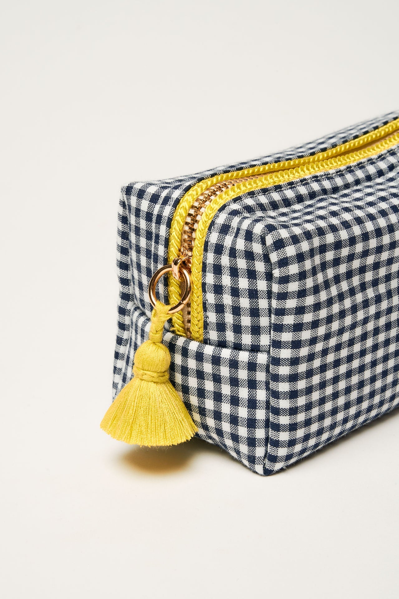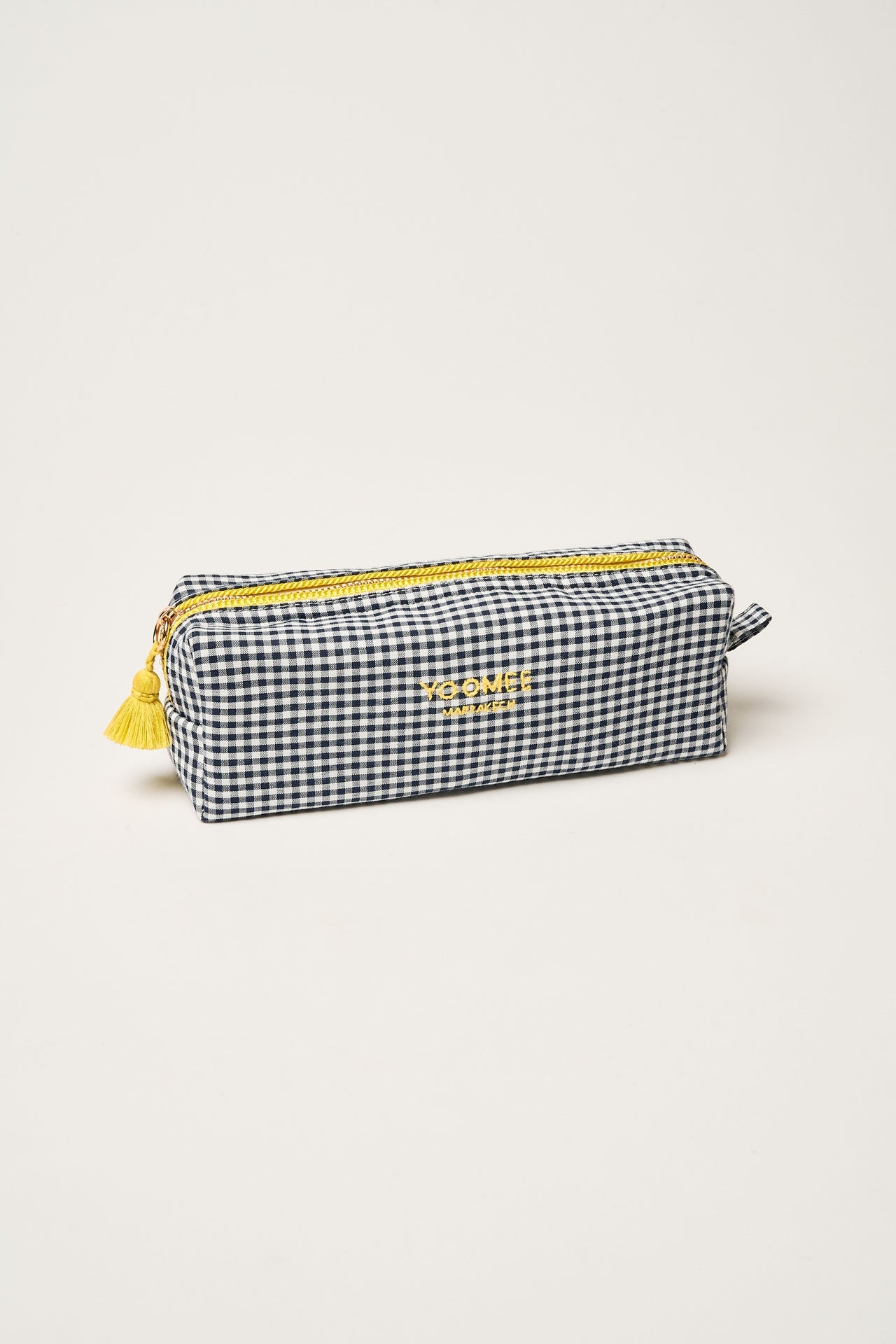 this colourful etui is perfectly sized for pens or brushes or your daily make up. it features unique cotton fabrics, a hand-embroidered logo and an intricate border along the zipper. it also has a cute little tassel on the zipper.