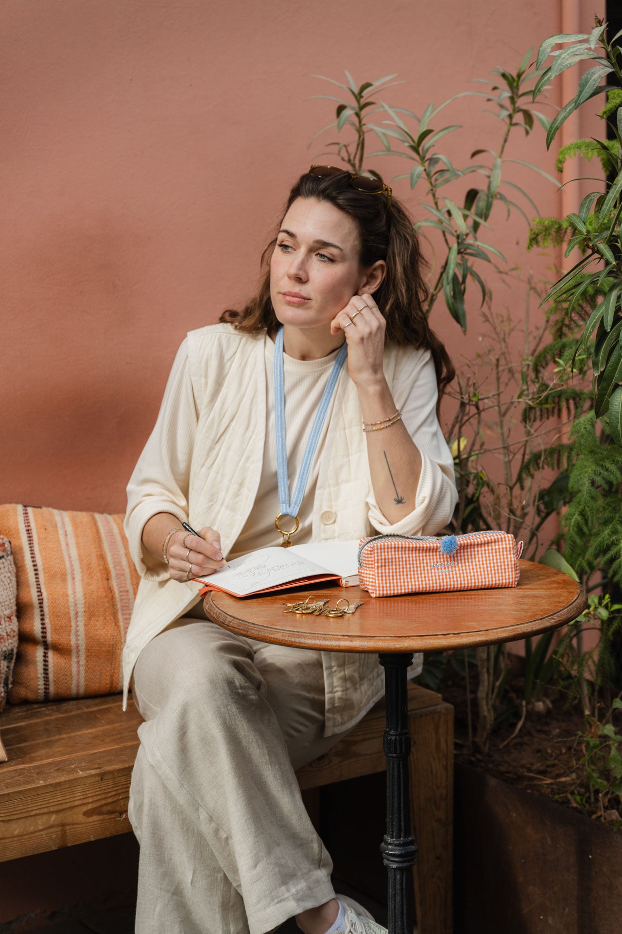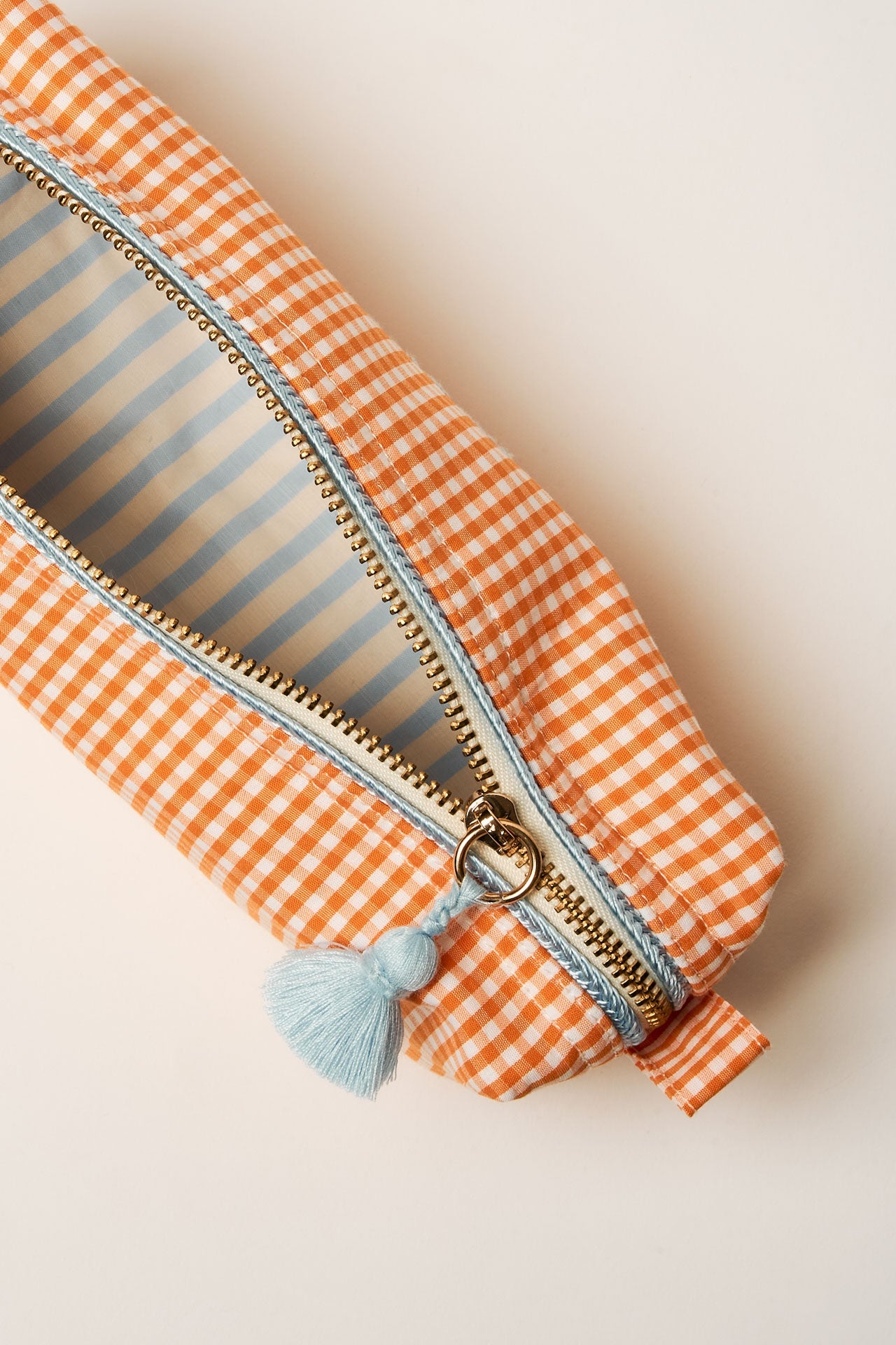 this colourful etui is perfectly sized for pens or brushes or your daily make up. it features unique cotton fabrics, a hand-embroidered logo and an intricate border along the zipper. it also has a cute little tassel on the zipper.