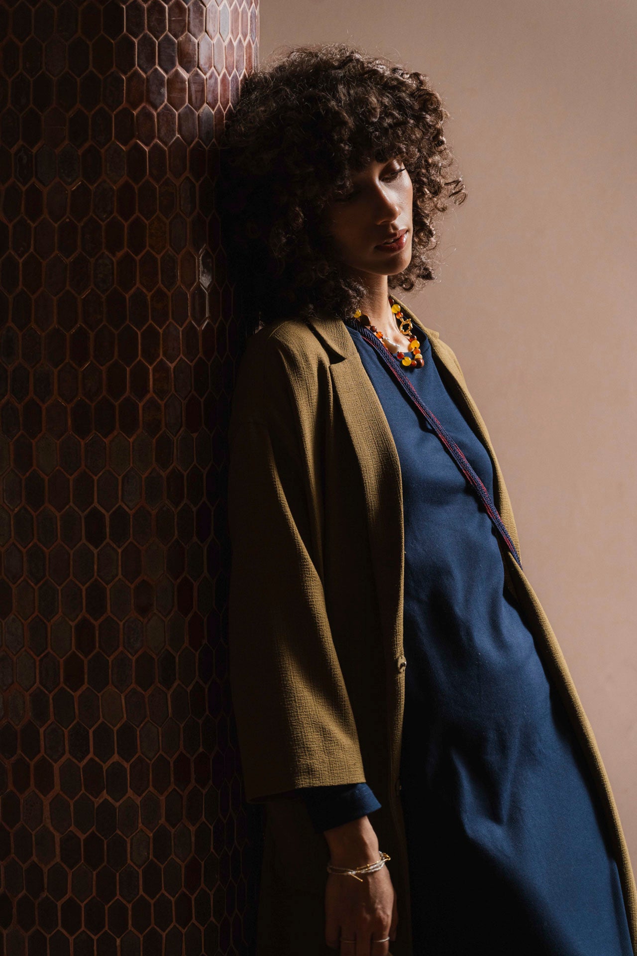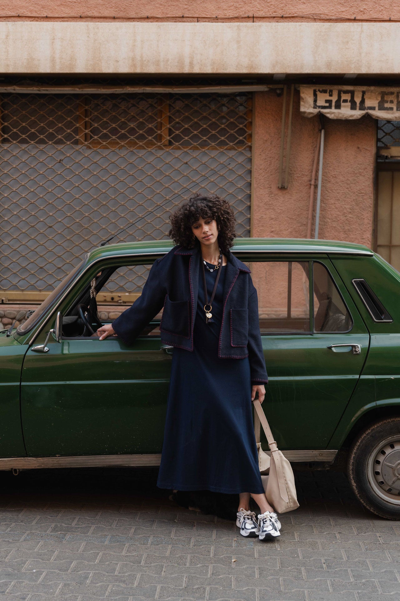 a sleek dark marine dress that embodies understated elegance and everyday versatility.