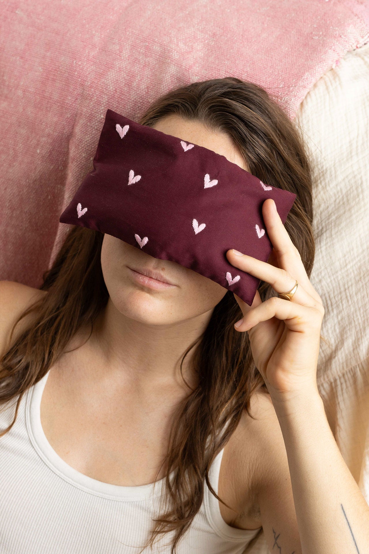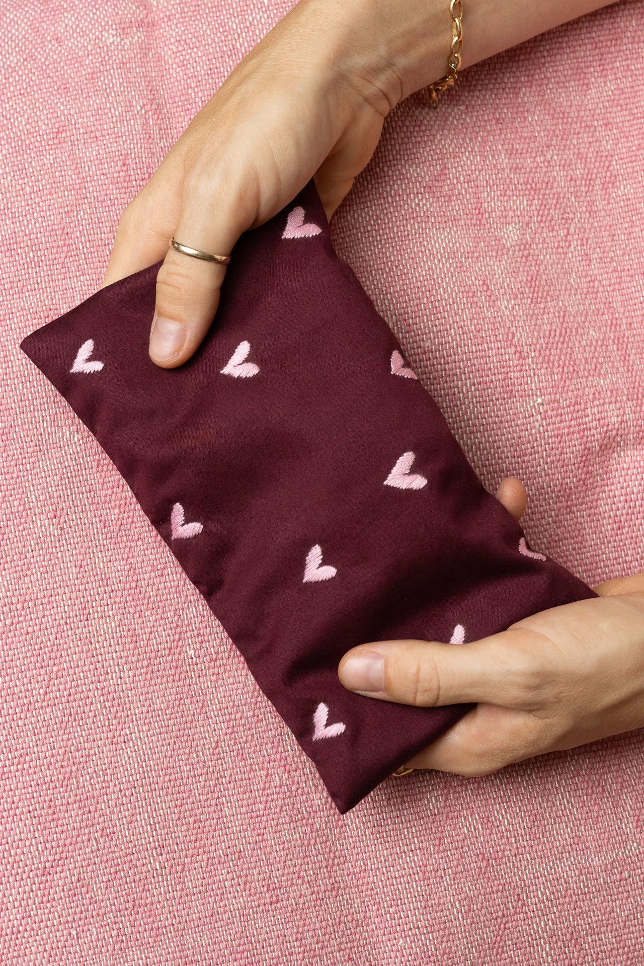 this eye pillow will offer you a moment of peace and calm. it is handmade by our women's association in the medina of marrakech. the inside pillow can be removed and the outer pillow can be hand washed. this eye pillow is scented with millet seeds and lavender. the pillow is embroidered by hand with sweet little hearts.
