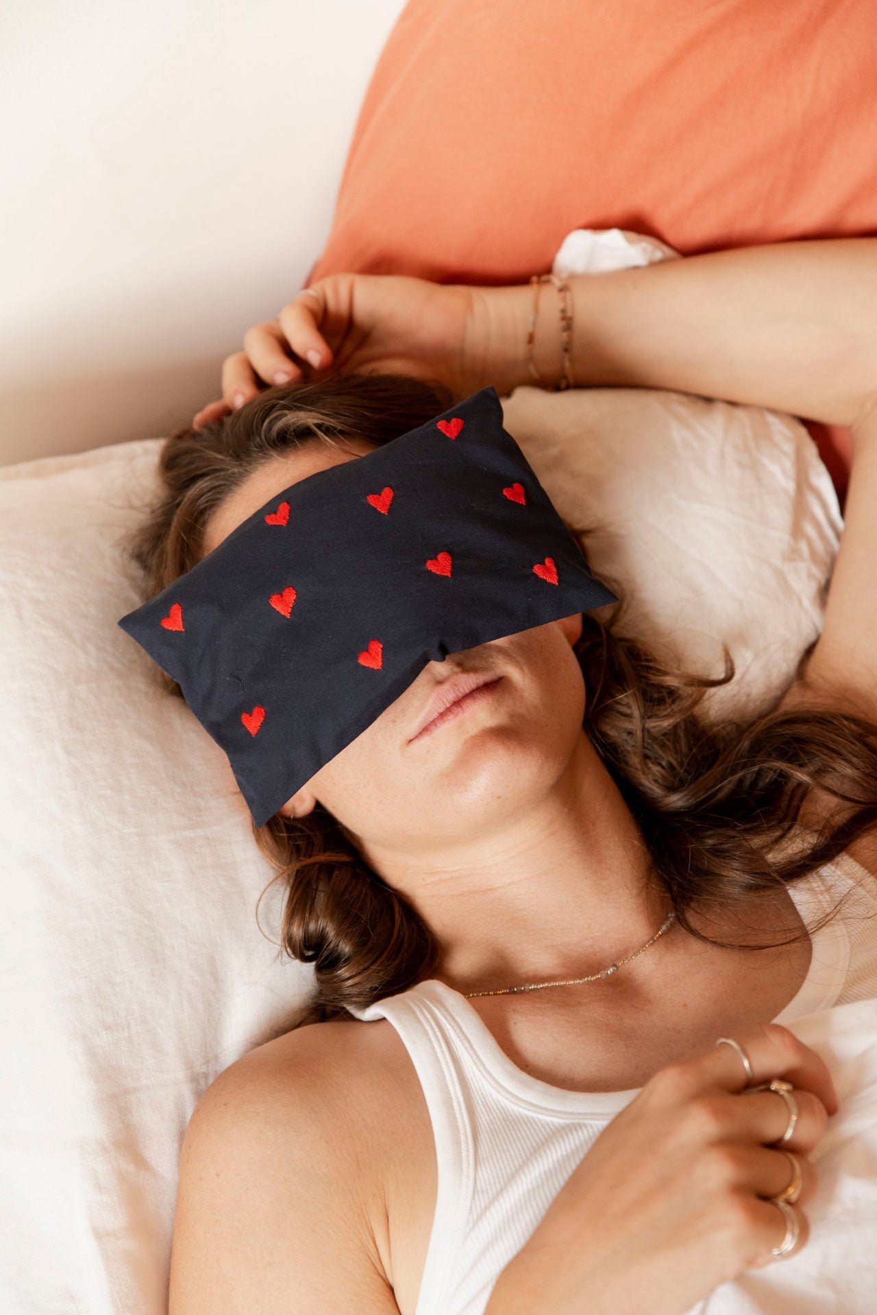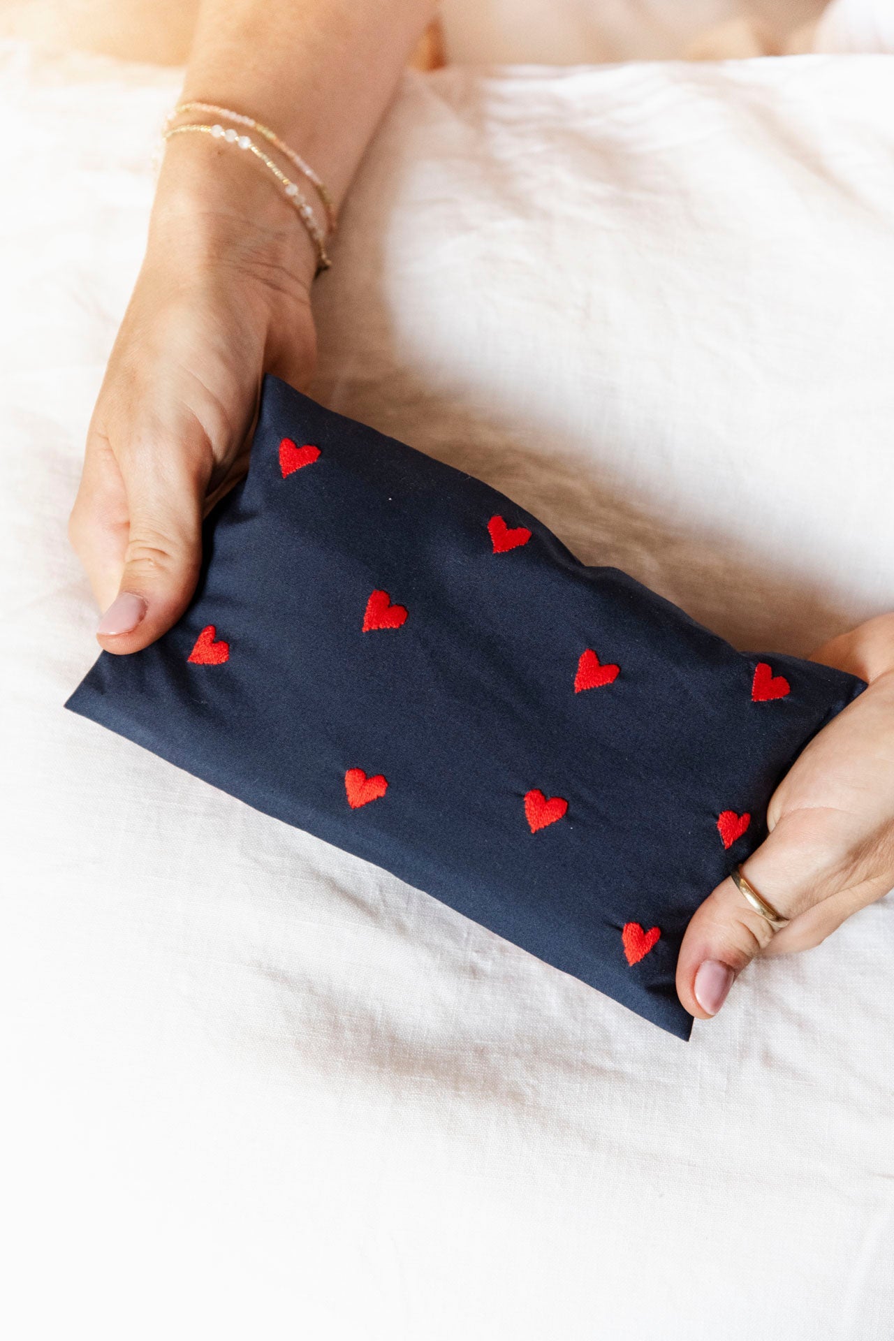 this eye pillow will offer you a moment of peace and calm. it is handmade by our women's association in the medina of marrakech. the inside pillow can be removed and the outer pillow can be hand washed. this eye pillow is scented with millet seeds and lavender. the pillow is embroidered by hand with sweet little hearts.