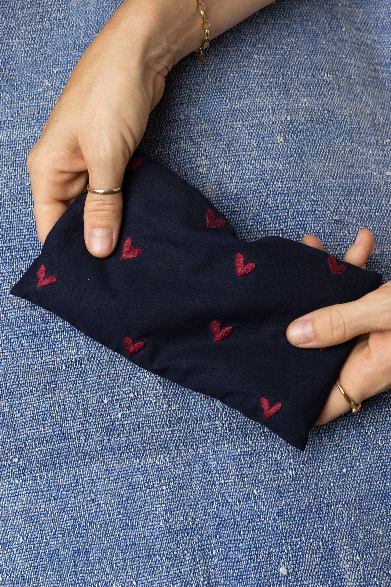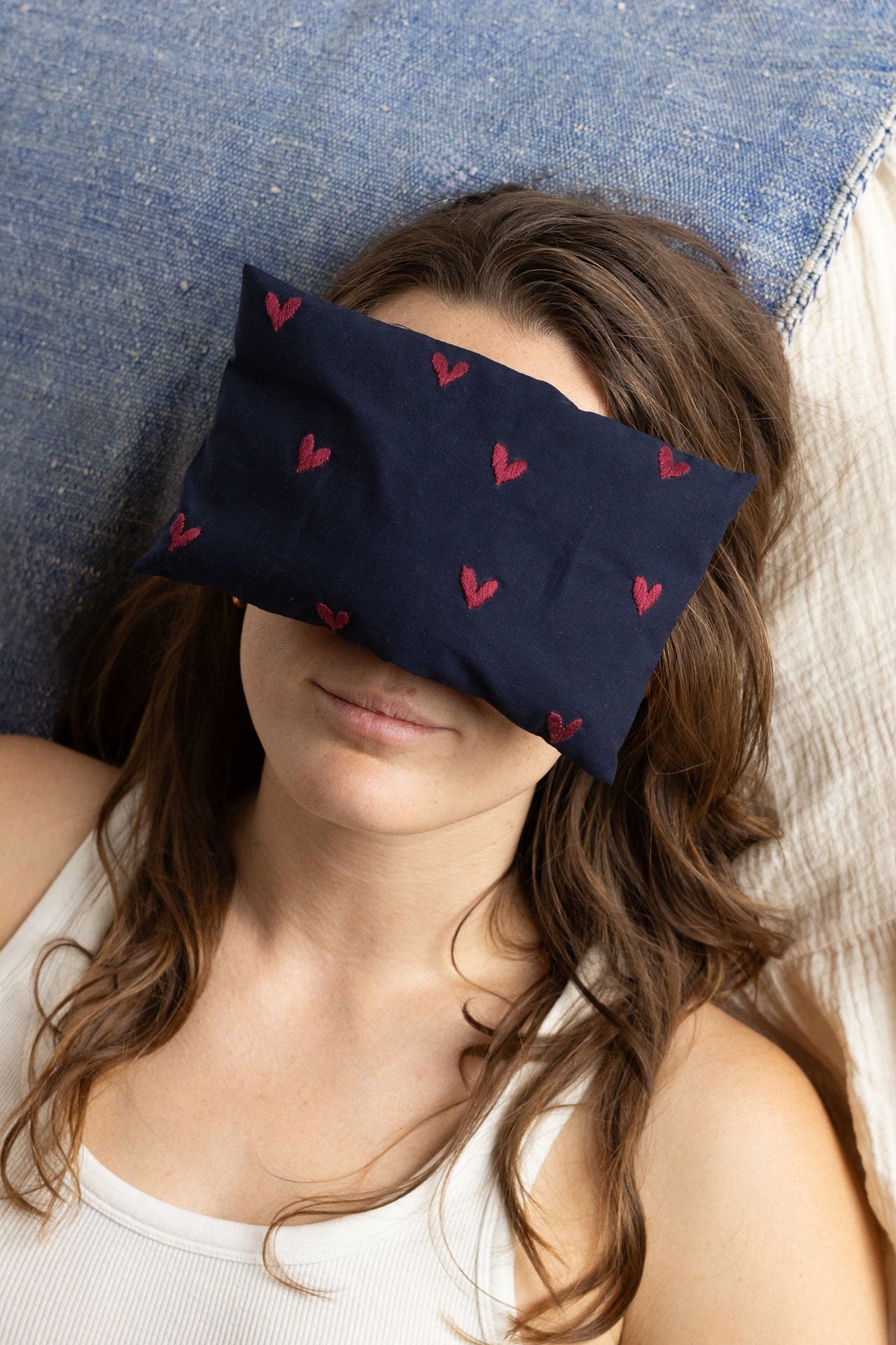 this eye pillow will offer you a moment of peace and calm. it is handmade by our women's association in the medina of marrakech. the inside pillow can be removed and the outer pillow can be hand washed. this eye pillow is scented with millet seeds and lavender. the pillow is embroidered by hand with sweet little hearts.