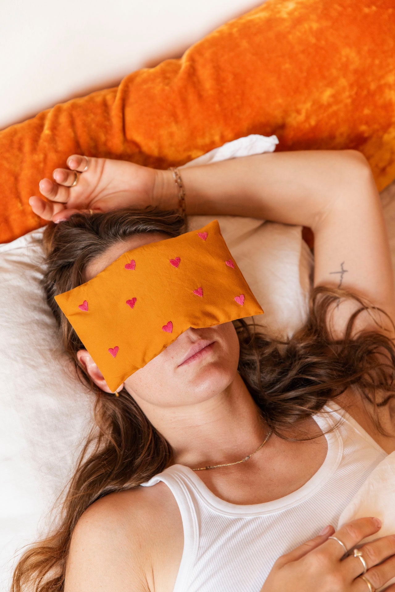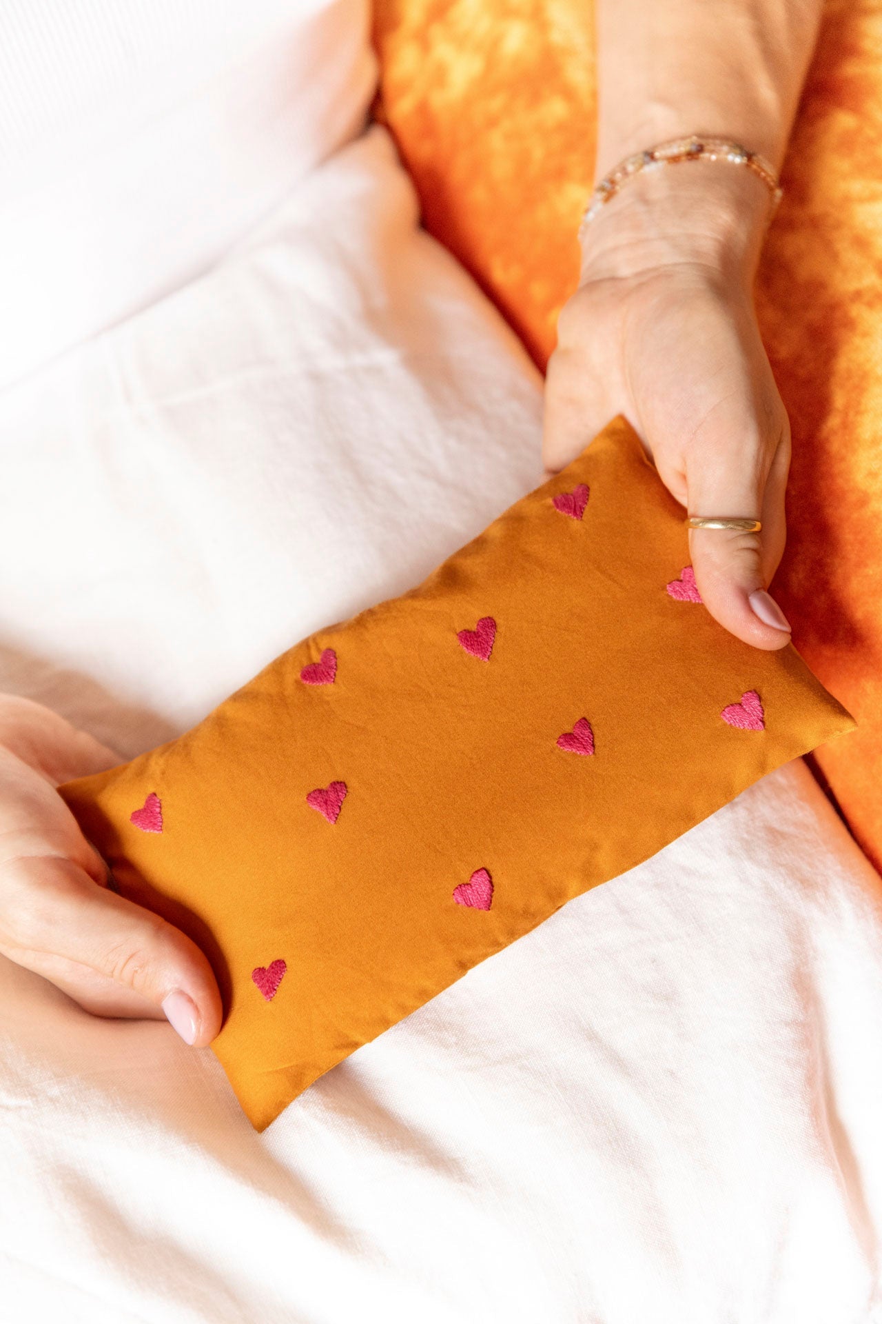 this eye pillow will offer you a moment of peace and calm. it is handmade by our women's association in the medina of marrakech. the inside pillow can be removed and the outer pillow can be hand washed. this eye pillow is scented with millet seeds and lavender. the pillow is embroidered by hand with sweet little hearts.