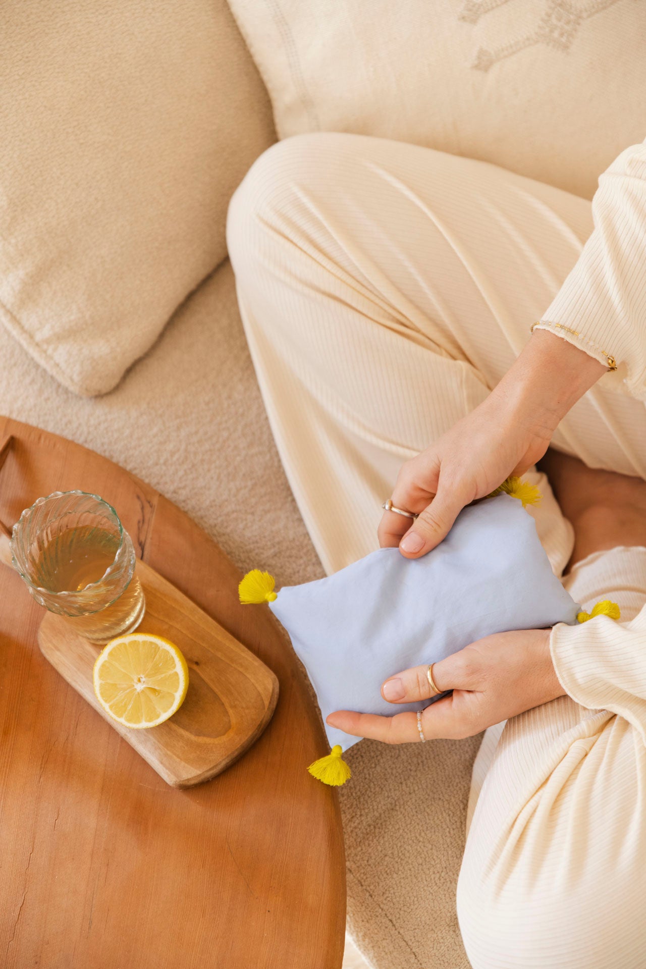 this eye pillow will offer you a moment of peace and calm. it is handmade by our women's association in the medina of marrakech. the inside pillow can be removed and the outer pillow can be hand washed. this eye pillow is scented with millet seeds and lavender. the pillow is neatly decorated by hand with 4 little tassels.