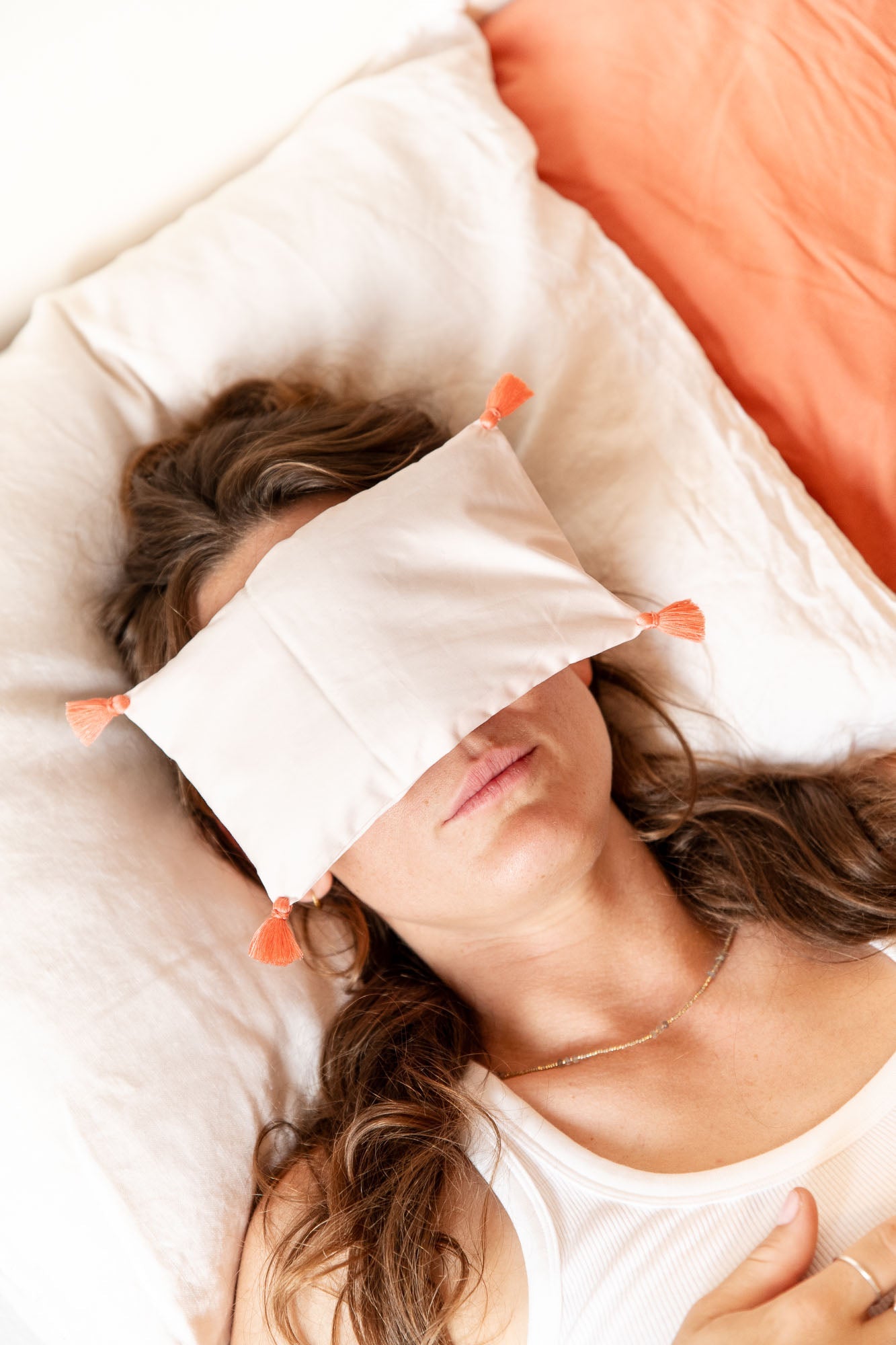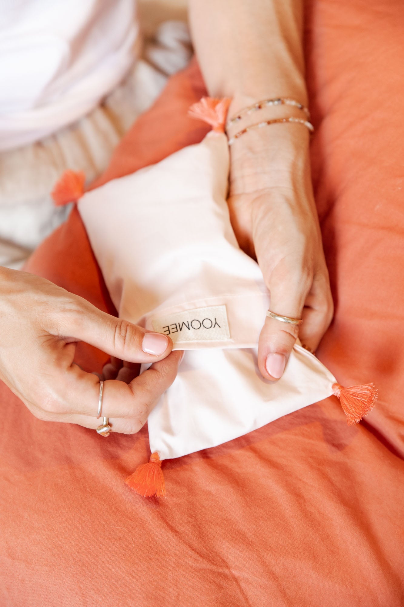 this eye pillow will offer you a moment of peace and calm. it is handmade by our women's association in the medina of marrakech. the inside pillow can be removed and the outer pillow can be hand washed. this eye pillow is scented with millet seeds and lavender. the pillow is neatly decorated by hand with 4 little tassels.