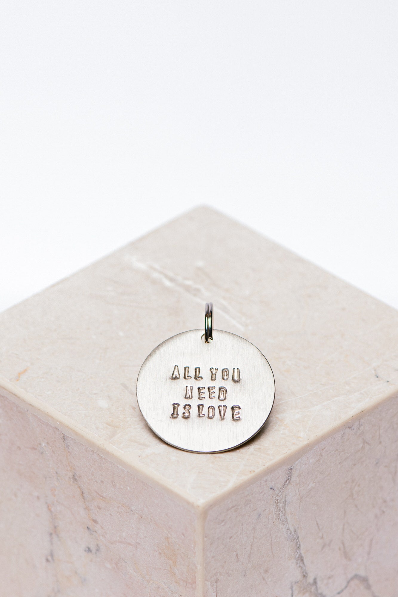 each keytag is carefully created by soufiane, a moroccan artisan. after cutting the metal and brass plates out by hand, he then solders and engraves them, giving each pendant a uniqueness. not one is the same as another.