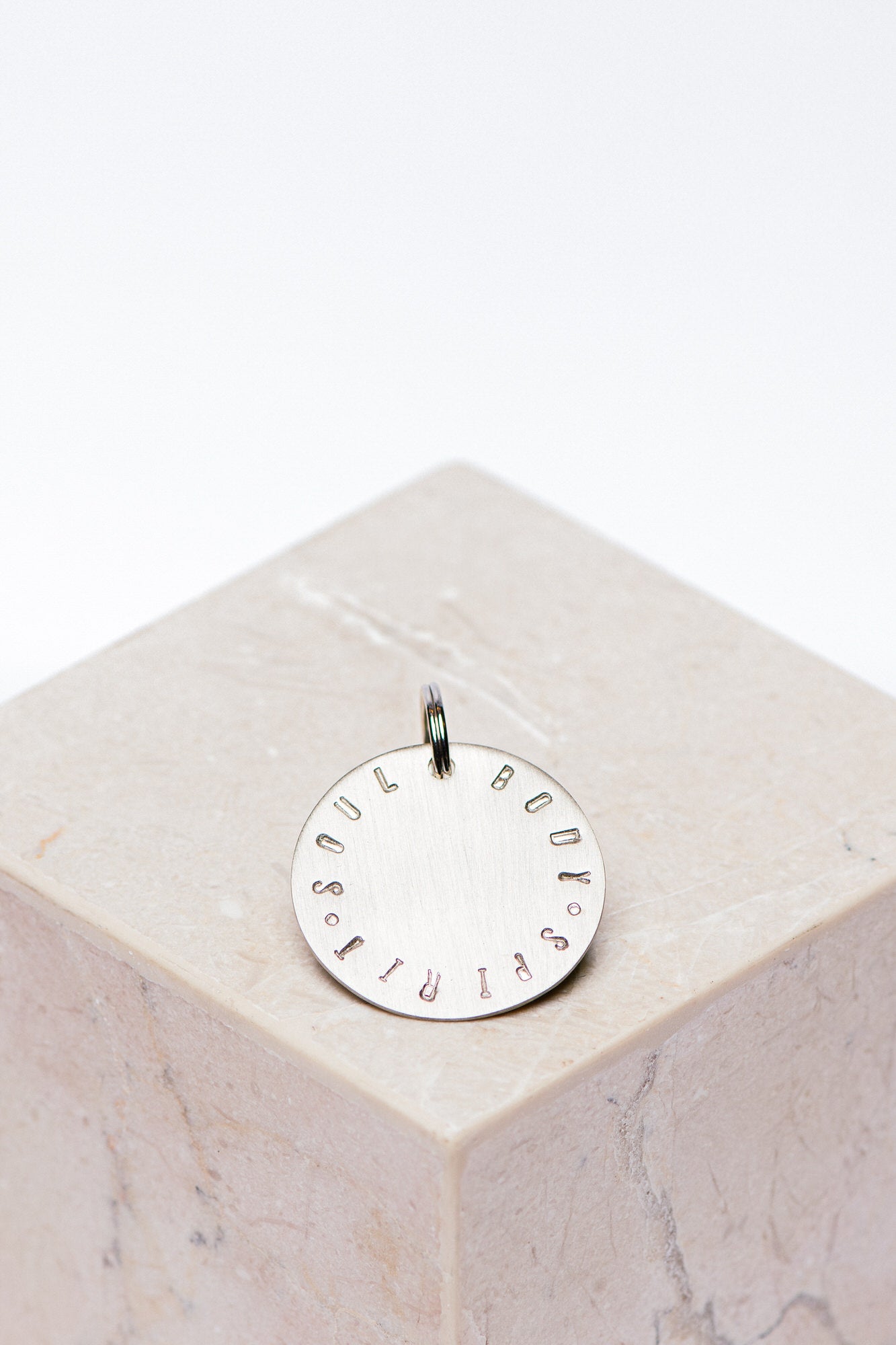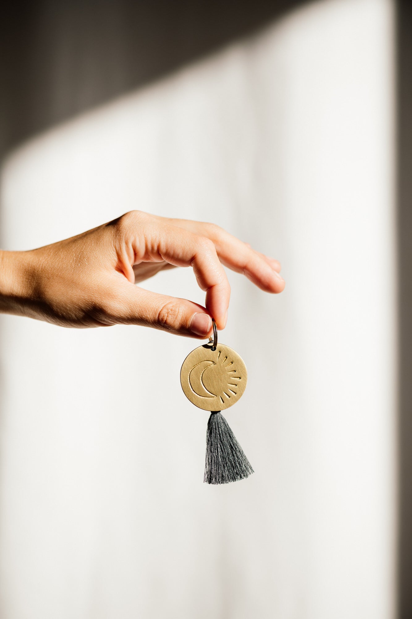 each keytag is carefully created by soufiane, a moroccan artisan. after cutting the metal and brass plates out by hand, he then solders and engraves them, giving each pendant a uniqueness. not one is the same as another.