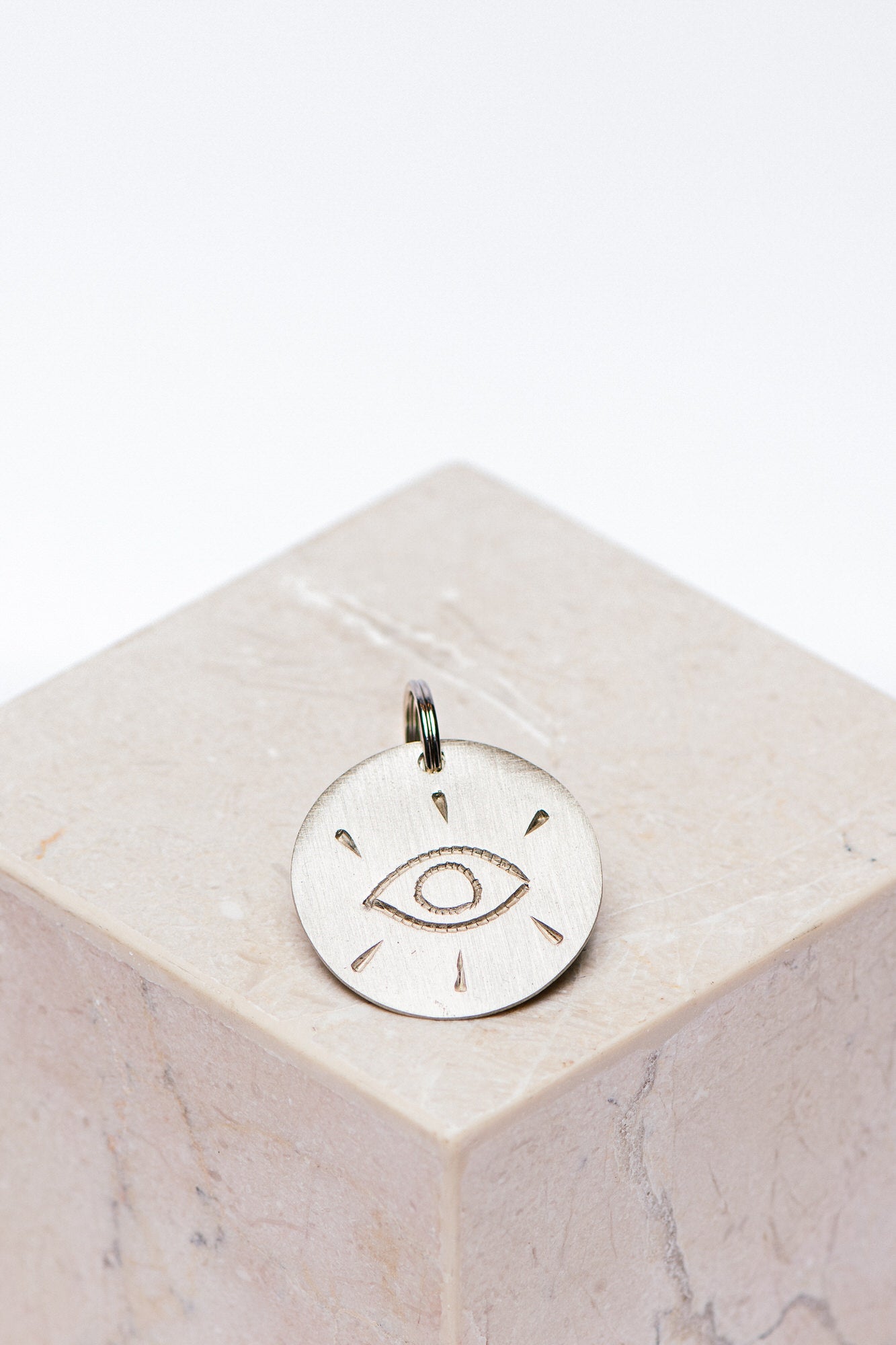 each keytag is carefully created by soufiane, a moroccan artisan. after cutting the metal and brass plates out by hand, he then solders and engraves them, giving each pendant a uniqueness. not one is the same as another.