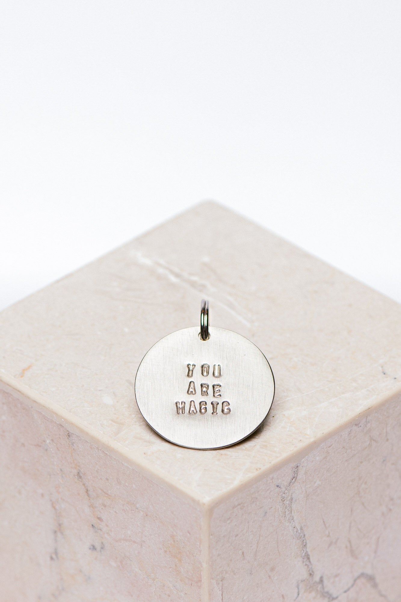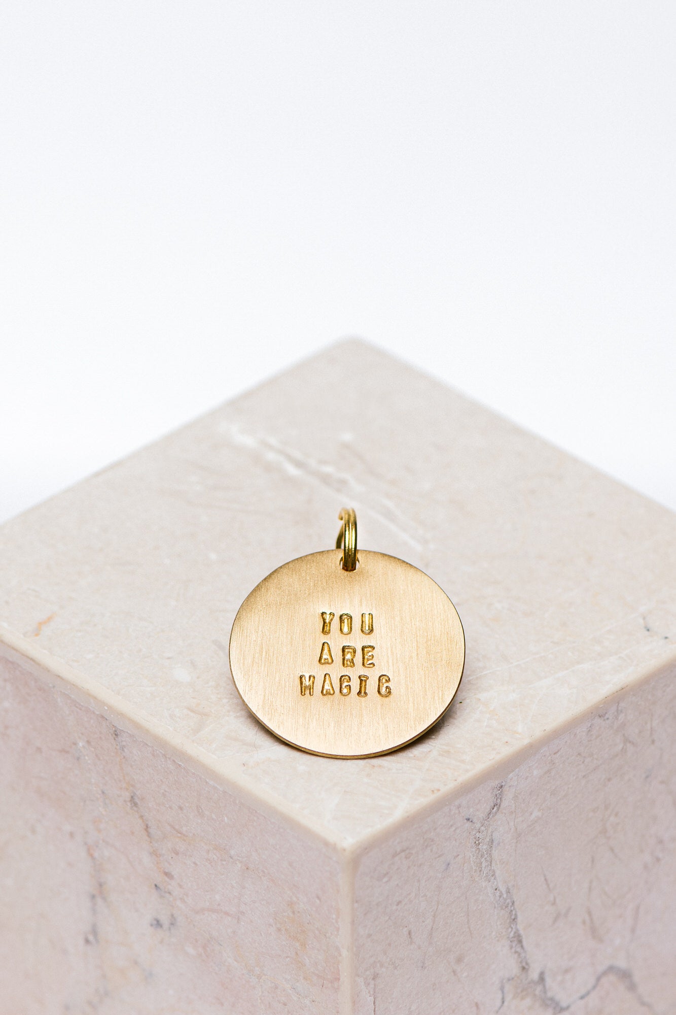 each keytag is carefully created by soufiane, a moroccan artisan. after cutting the metal and brass plates out by hand, he then solders and engraves them, giving each pendant a uniqueness. not one is the same as another.