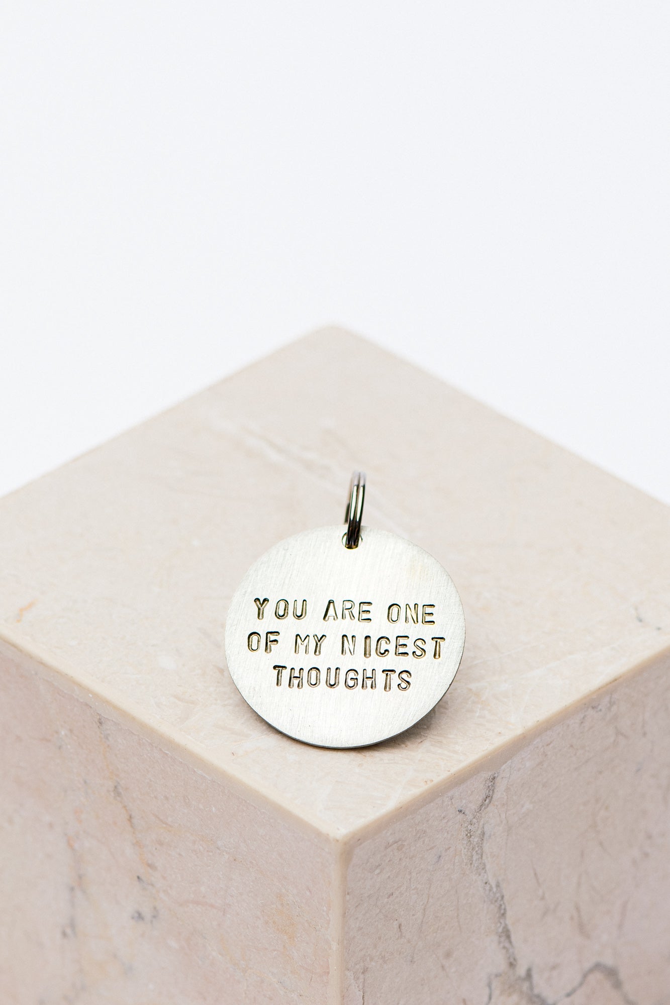 each keytag is carefully created by soufiane, a moroccan artisan. after cutting the metal and brass plates out by hand, he then solders and engraves them, giving each pendant a uniqueness. not one is the same as another.