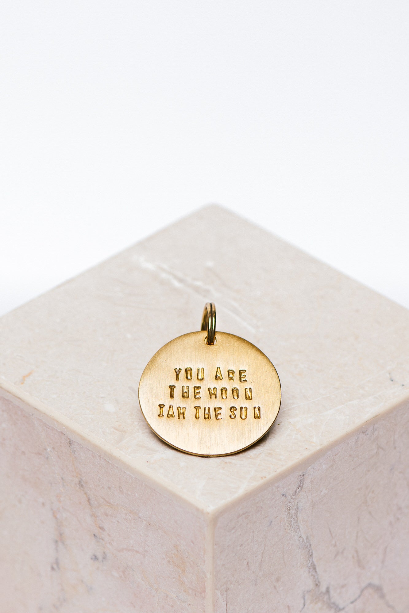 each keytag is carefully created by soufiane, a moroccan artisan. after cutting the metal and brass plates out by hand, he then solders and engraves them, giving each pendant a uniqueness. not one is the same as another.