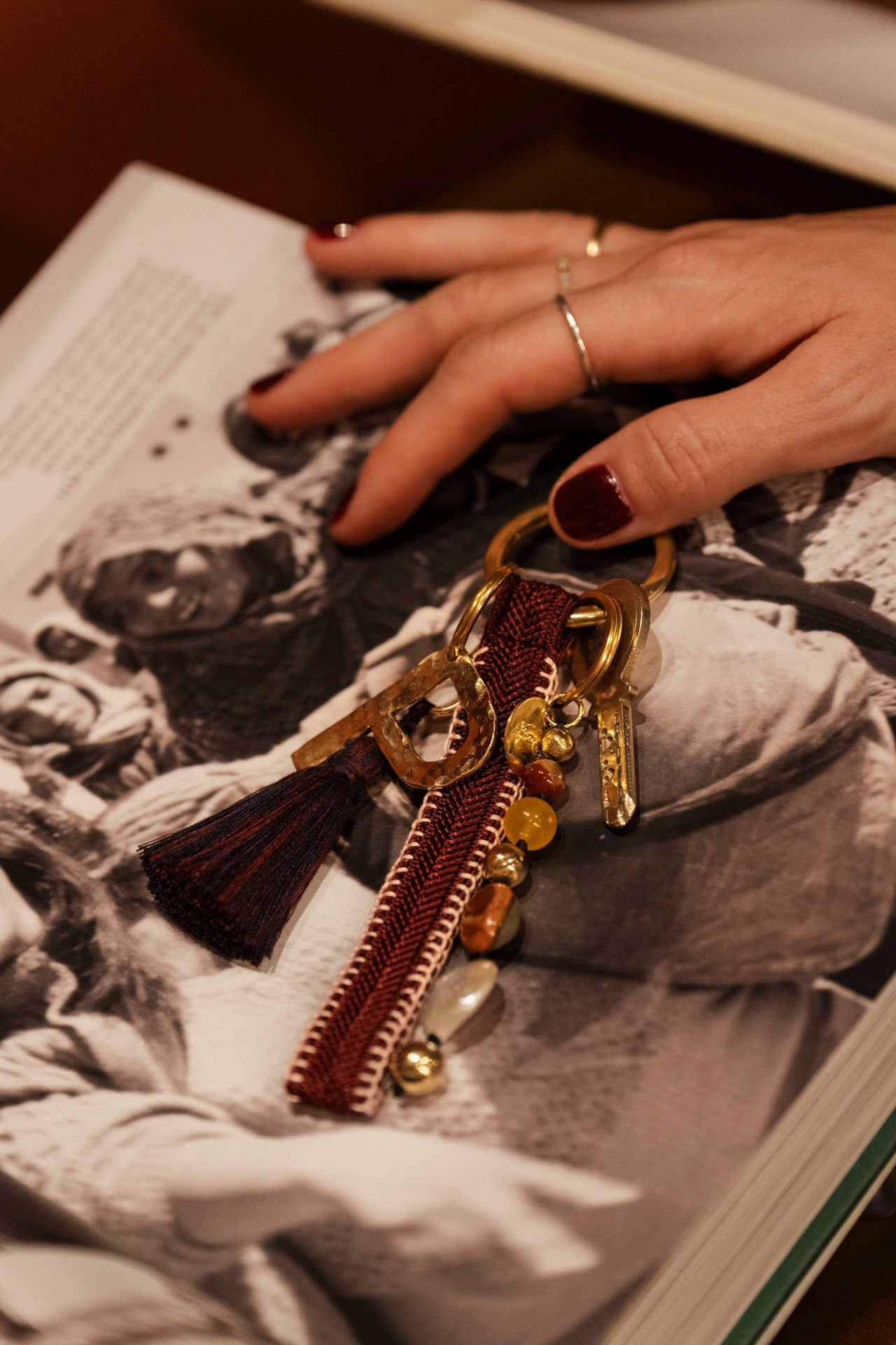 our JAMILA pendant is a unique accessory that brings together natural elegance and traditional craftsmanship. whether used as a bag charm or keychain, it features real semi-precious stones, a lustrous large pearl, and handcrafted brass beads made in marrakech.