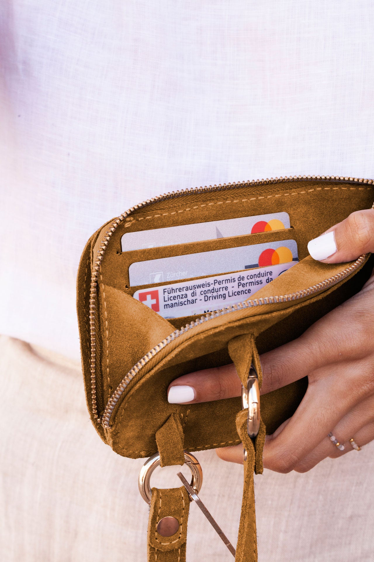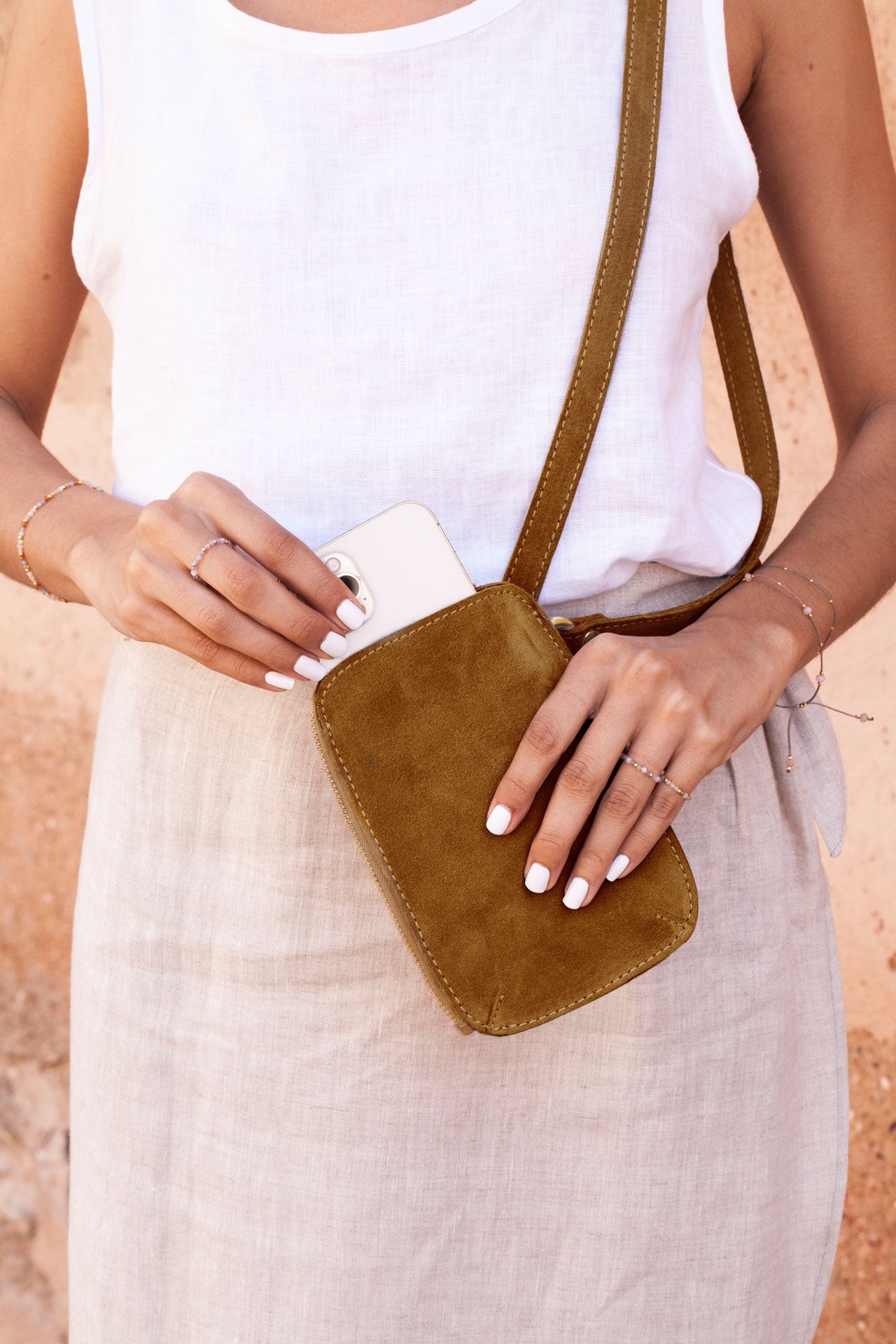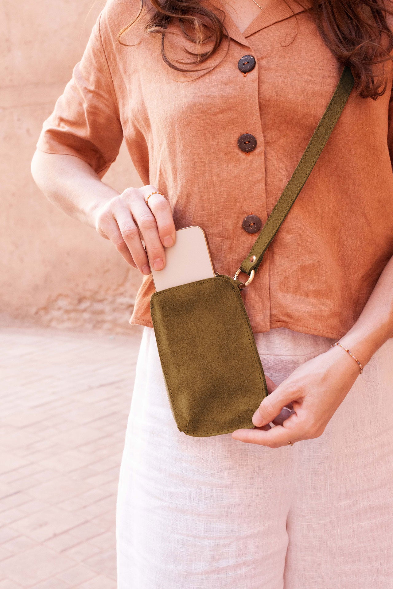 the practical rectangle phone case fits your most important things like mobile phone, cards, cash and keys. you can wear it as a crossbody this way you carry your most important things close and safe to your body.