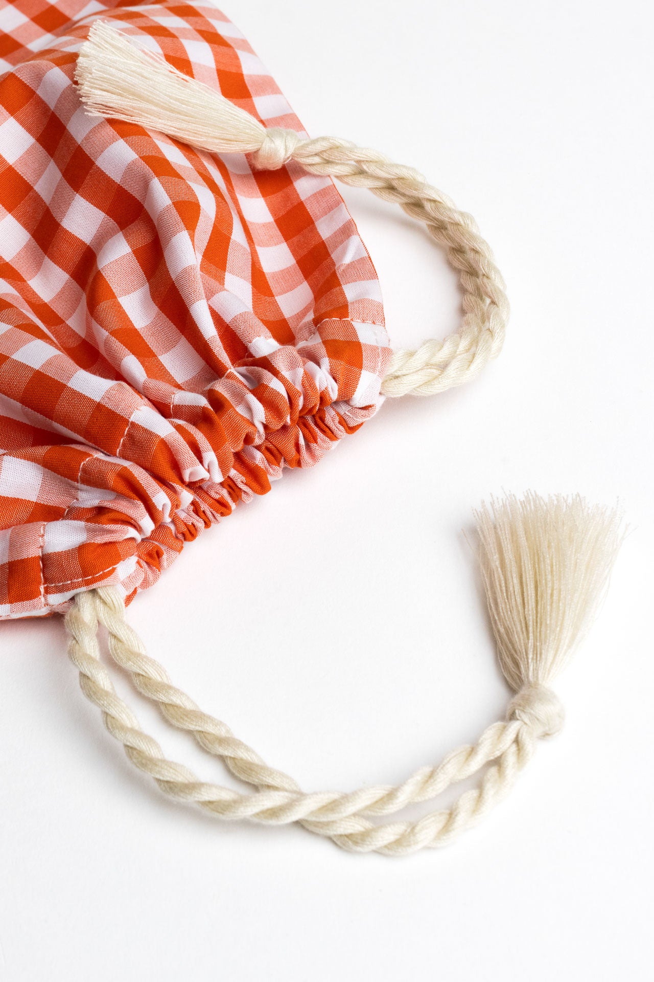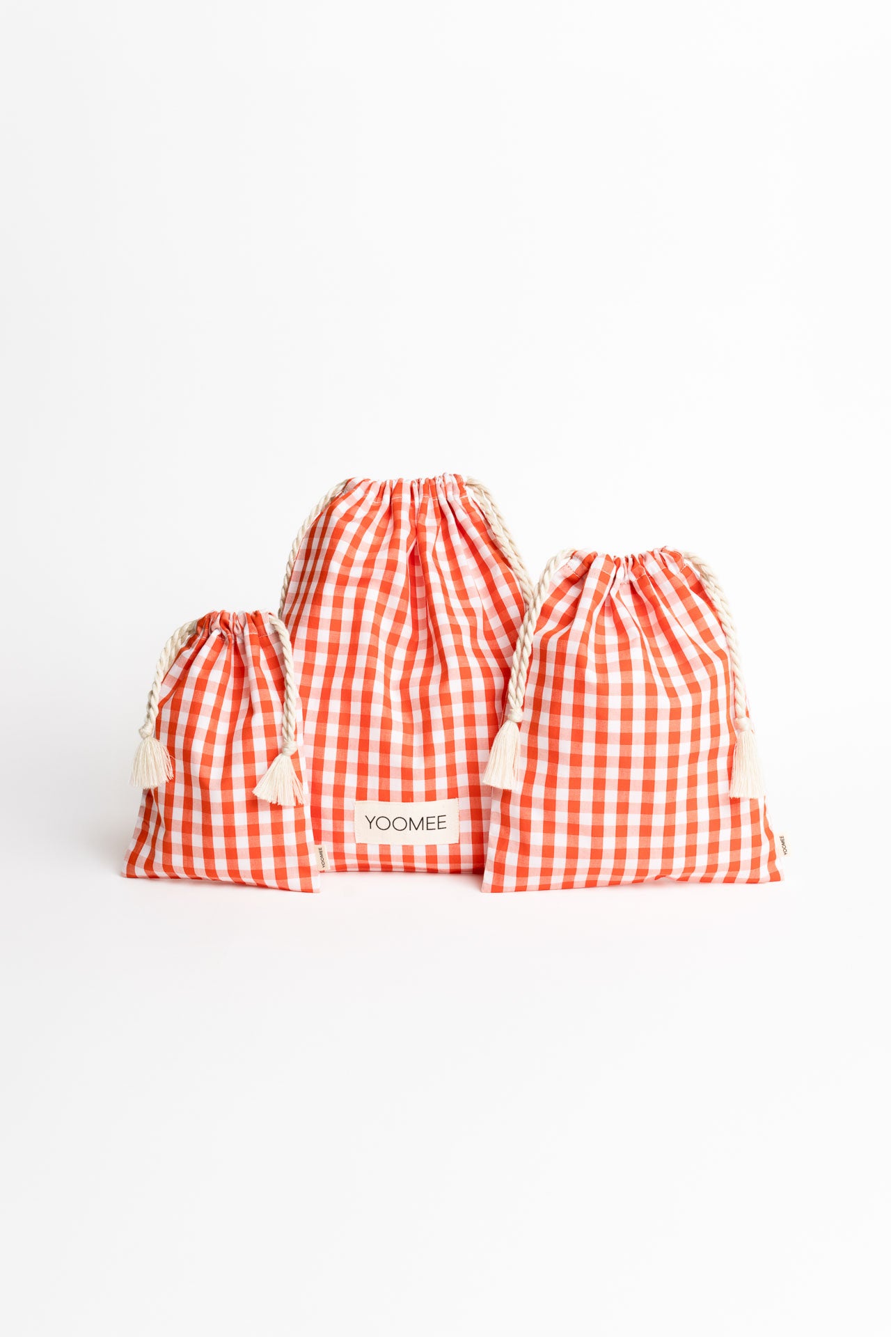 our little gift bag for all YOOMEE products – made exclusively from leftover fabrics to reduce waste and the beige cords are twisted by hand. the pouches are all made by our women's association in marrakech