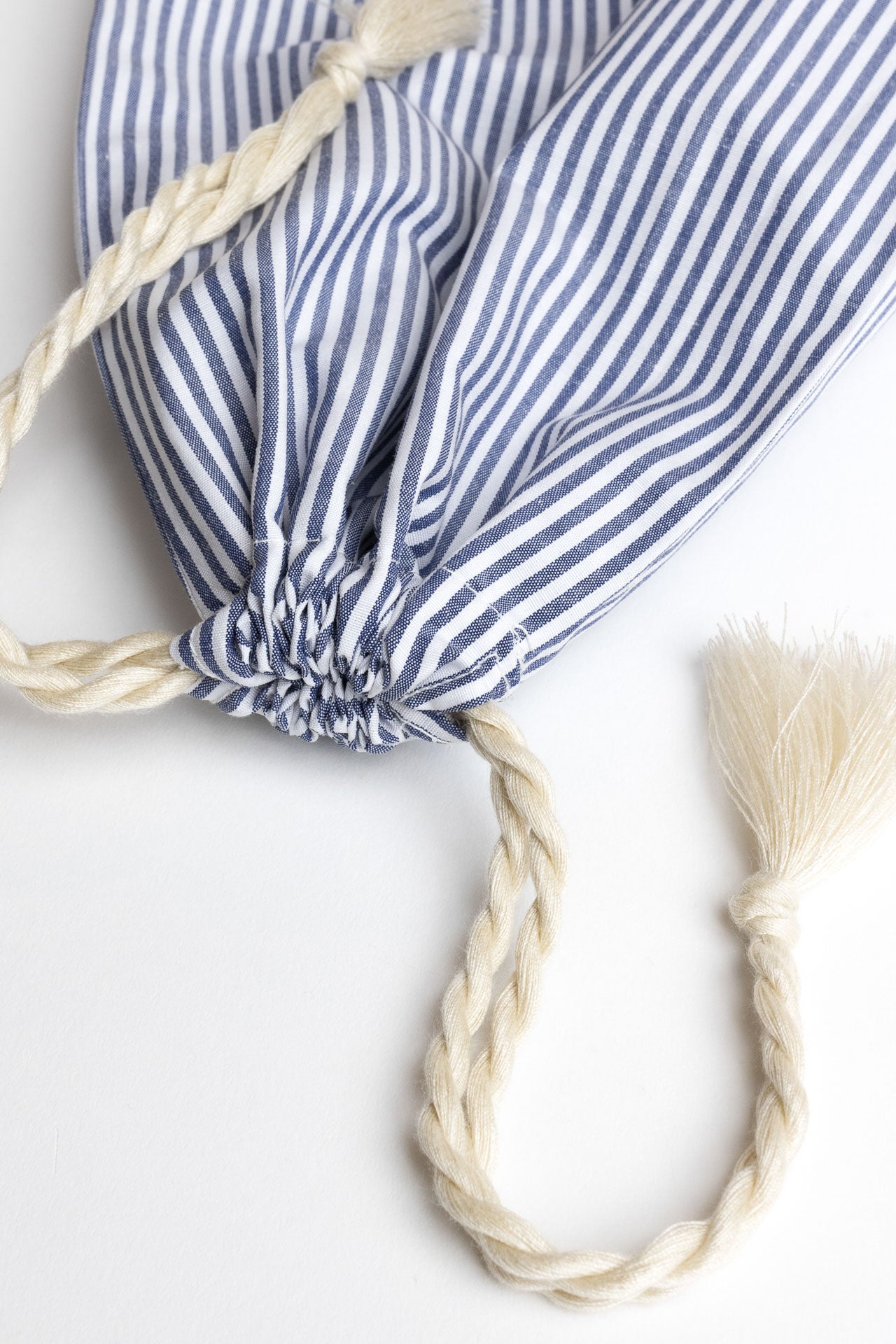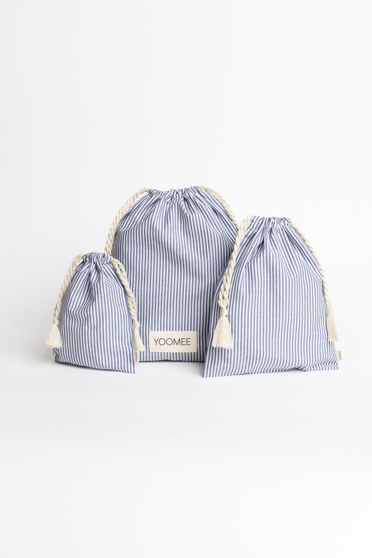 our little gift bag for all YOOMEE products – made exclusively from leftover fabrics to reduce waste and the beige cords are twisted by hand. the pouches are all made by our women's association in marrakech