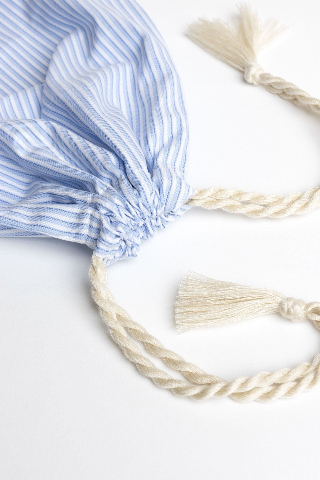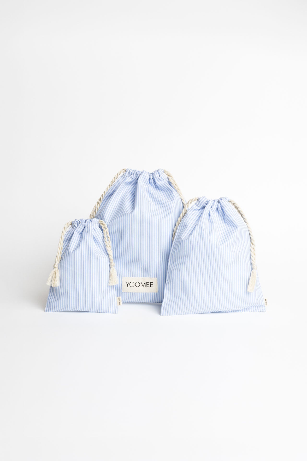 our little gift bag for all YOOMEE products – made exclusively from leftover fabrics to reduce waste and the beige cords are twisted by hand. the pouches are all made by our women's association in marrakech