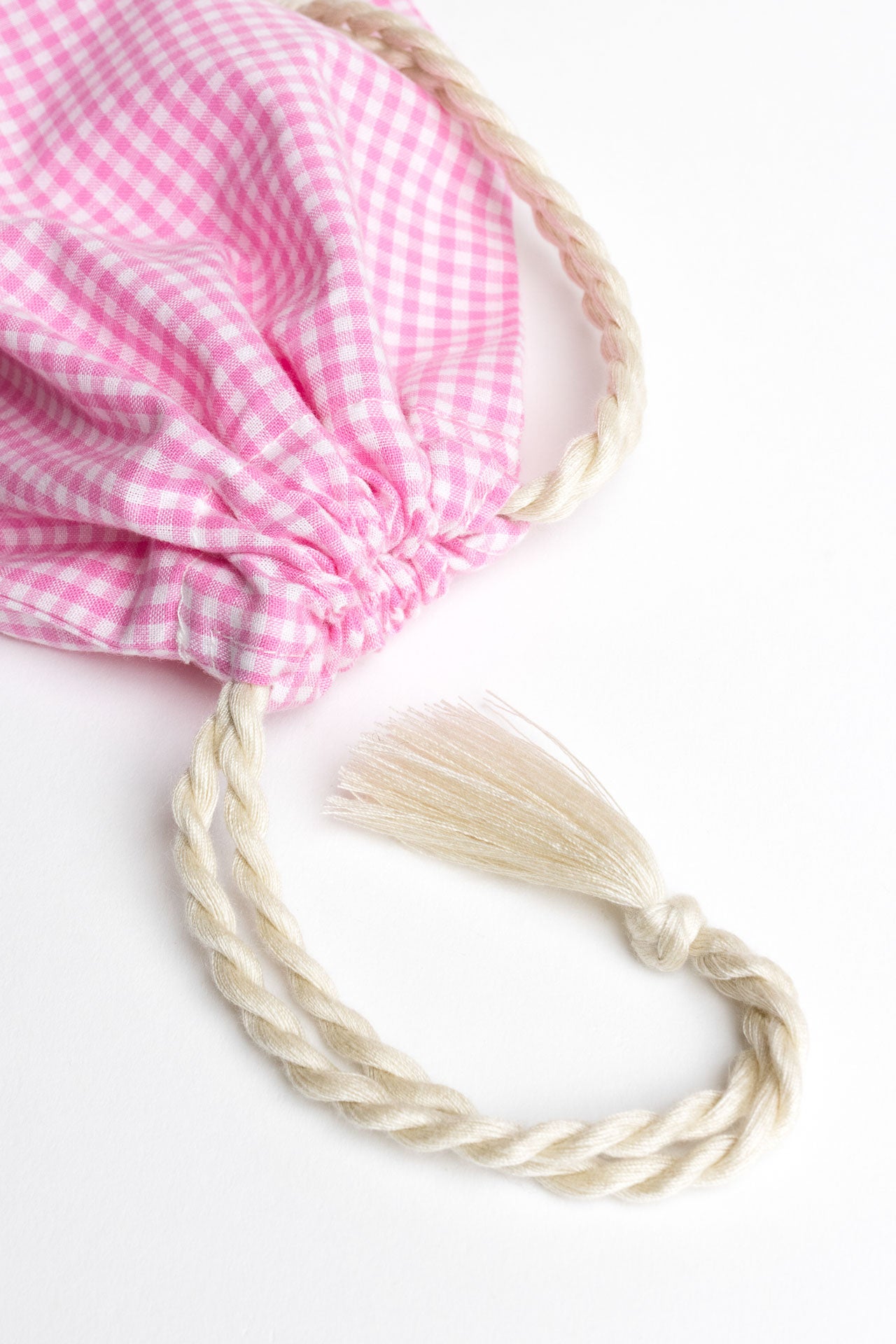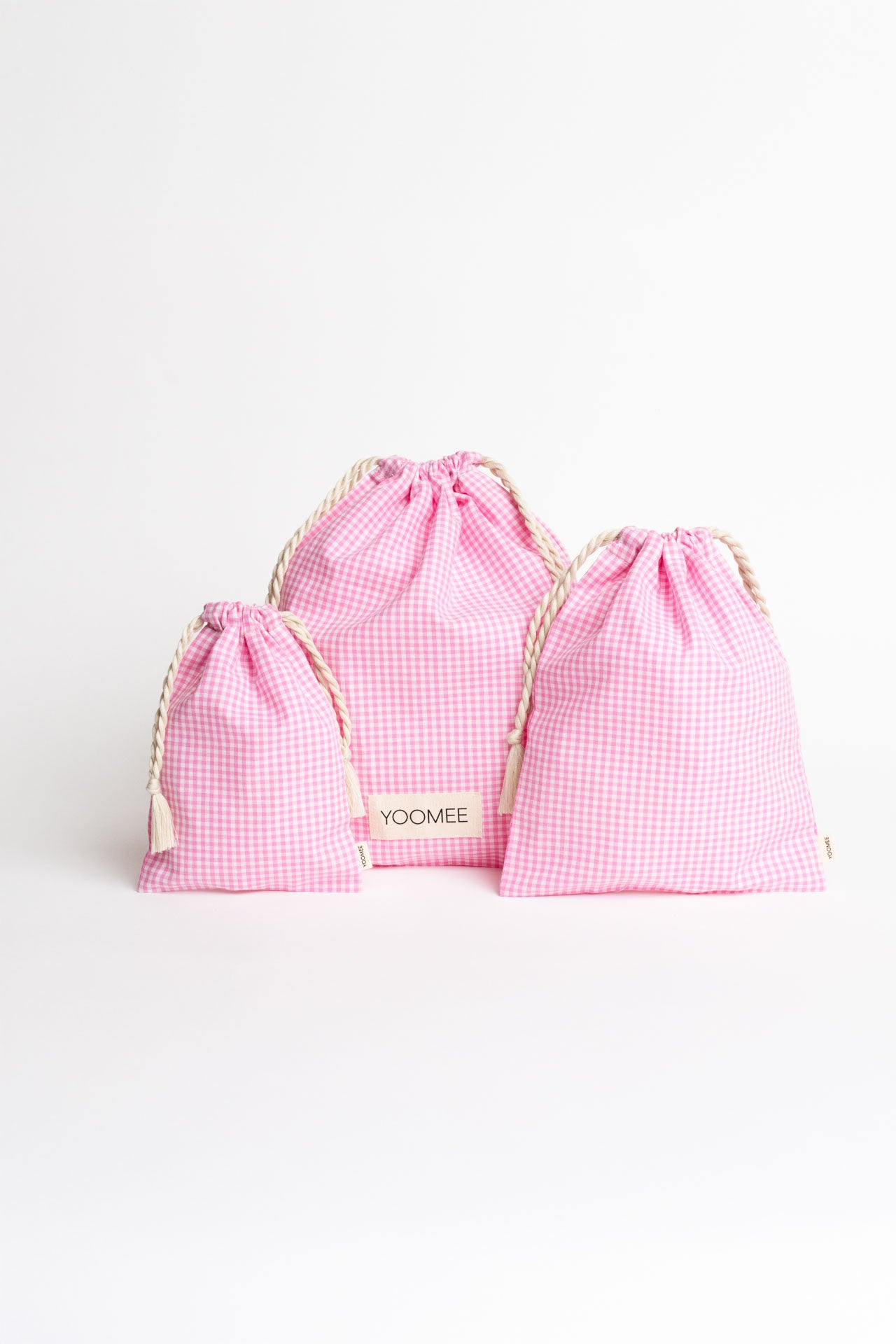 our little gift bag for all YOOMEE products – made exclusively from leftover fabrics to reduce waste and the beige cords are twisted by hand. the pouches are all made by our women's association in marrakech