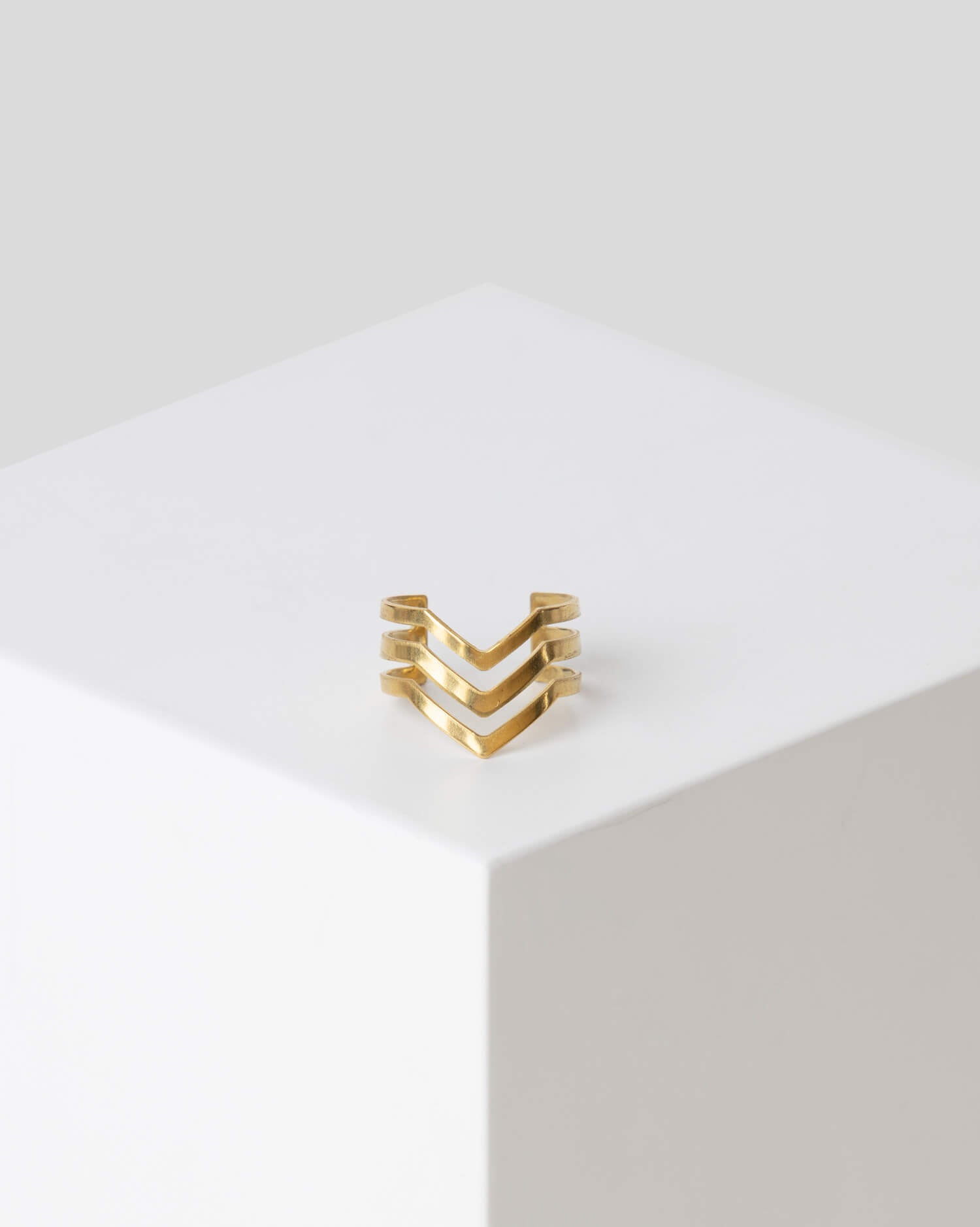 all rings are made of raw brass. thanks to the geometric design and the uniform material, several rings can be combined on one hand. each ring is adjustable and can therefore be varied in size.