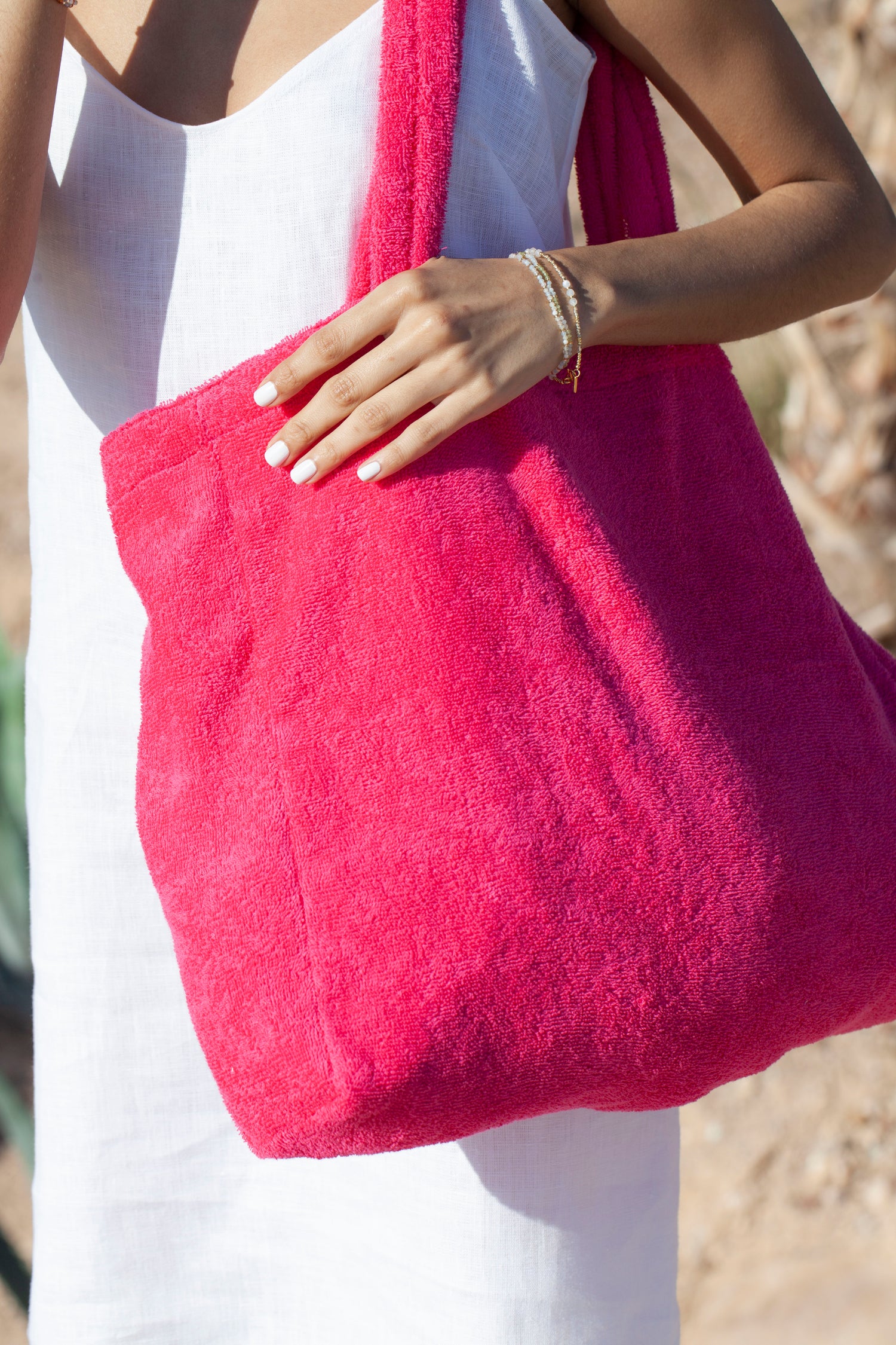 this bag is the perfect bag for all your things you need for a day at the river, lake or ocean. it is made out of fluffy cotton terry. in the inside you can find a pocket with zipper - like that you can keep your Important things safe. there is also a loop for your keys to keep your bag organized.