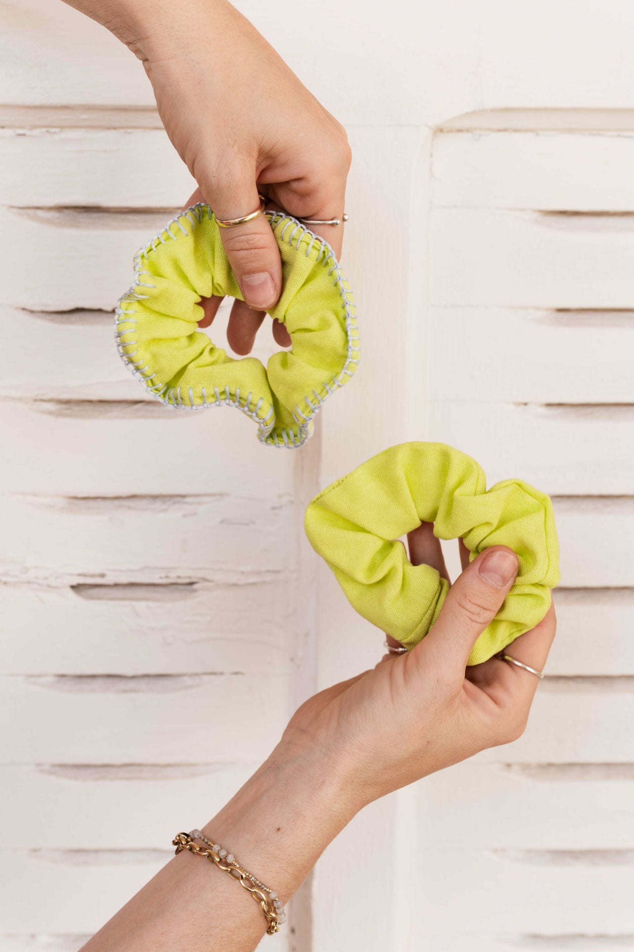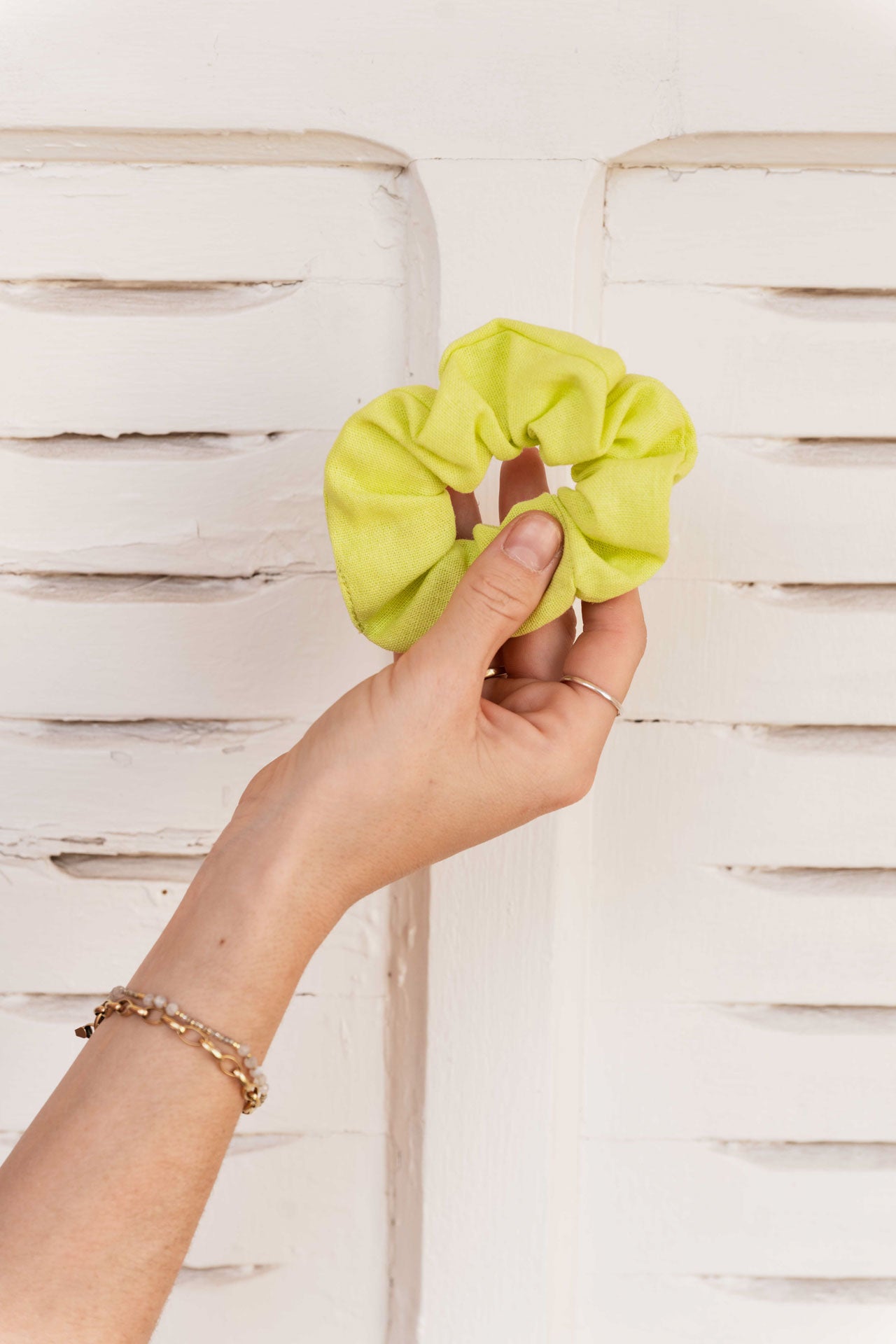 this scrunchie is crafted from leftover linen. the nice fabrics is not only gentle for your hair, it also adds a playful touch to your look.