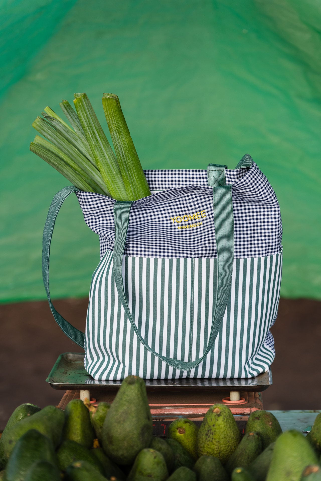 this colorful tote bag is perfectly sized for all your daily essentials. it features unique cotton fabrics and a hand-embroidered logo. It has two pockets on the outside and a pocket with a sweet little tassel on the zipper inside.