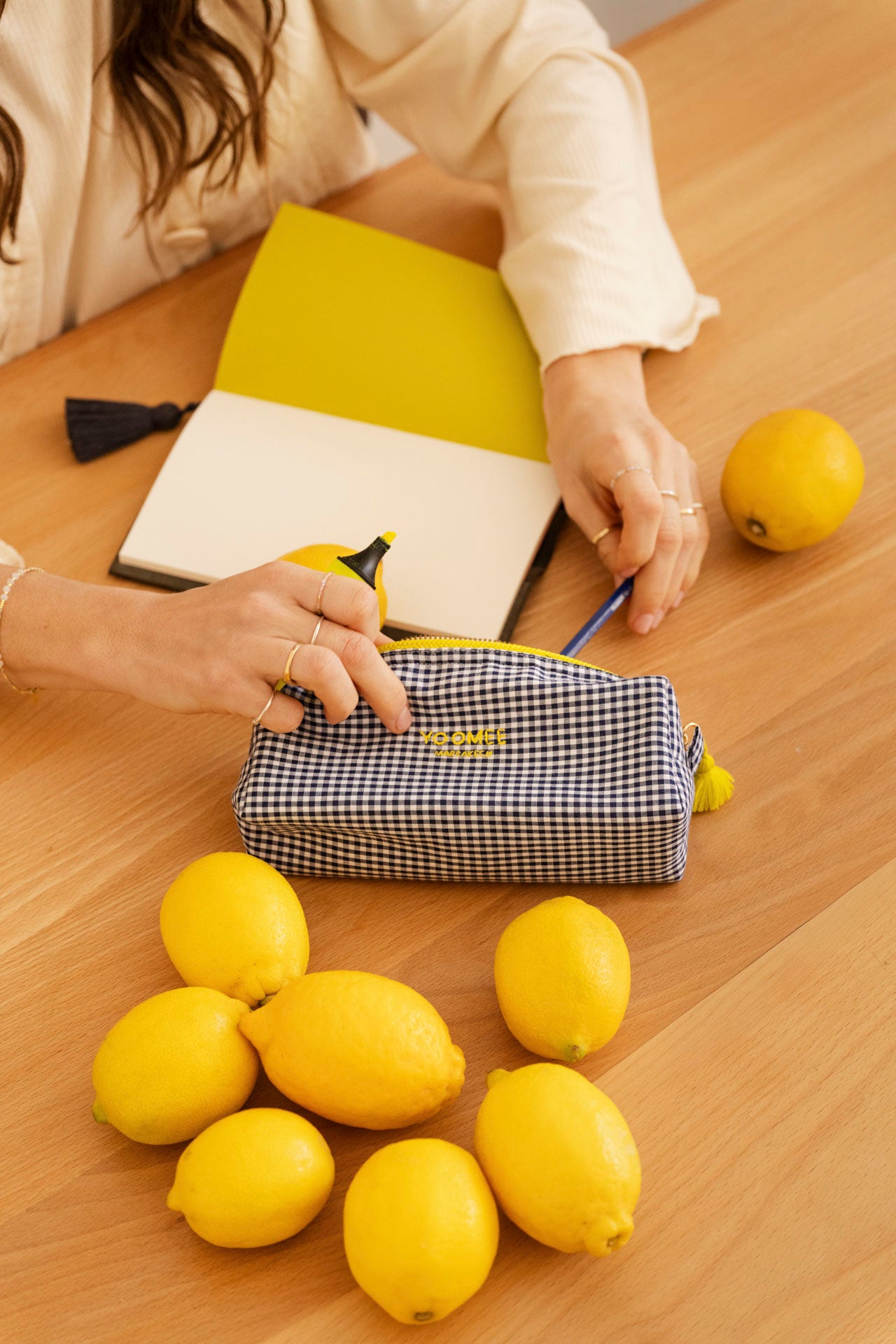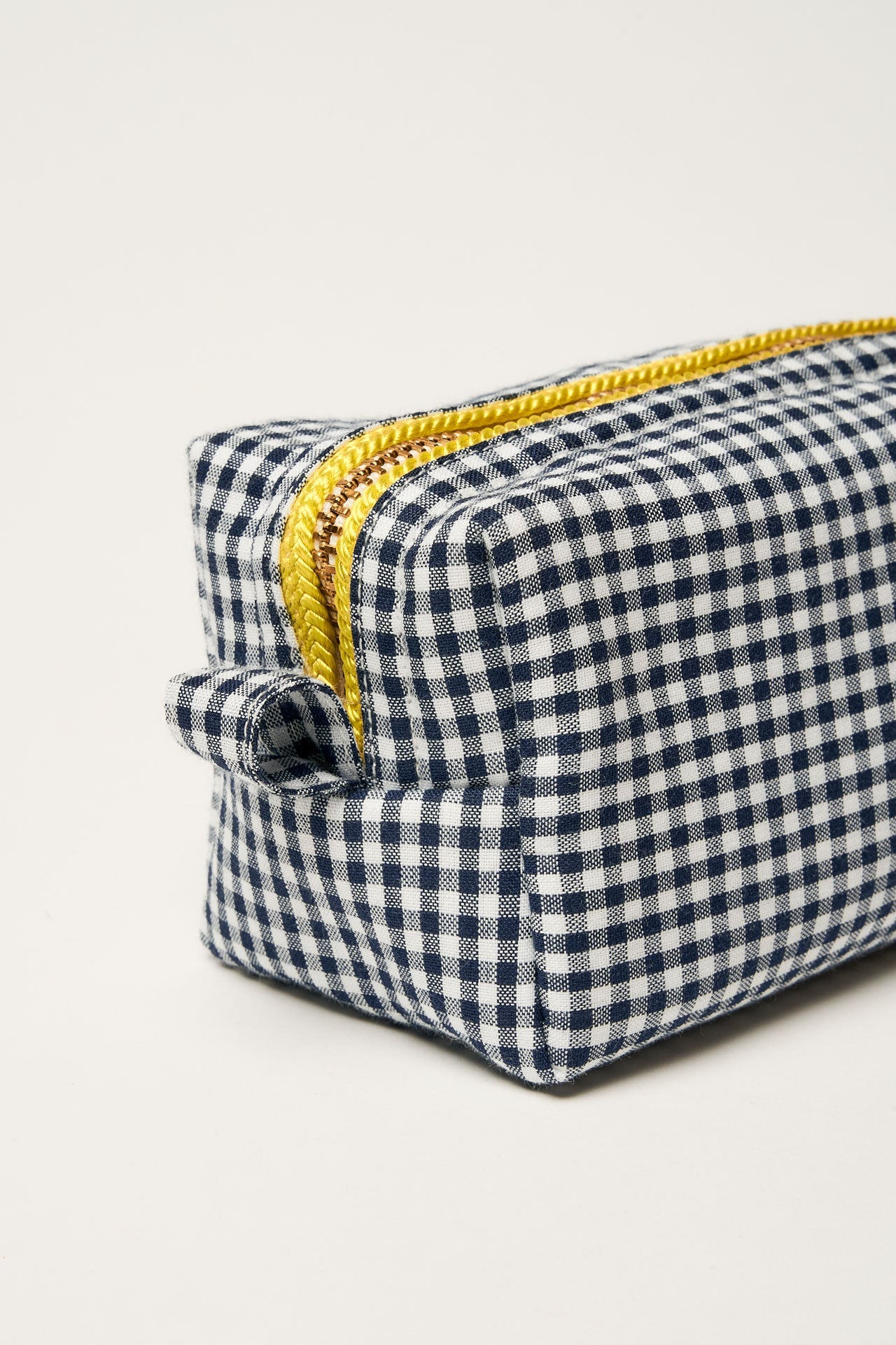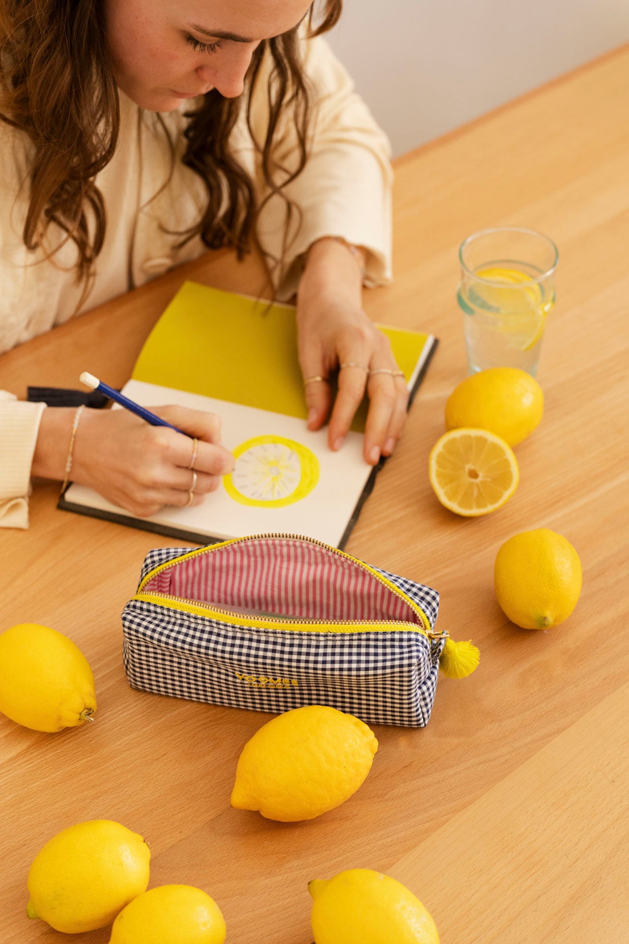 this colourful etui is perfectly sized for pens or brushes or your daily make up. it features unique cotton fabrics, a hand-embroidered logo and an intricate border along the zipper. it also has a cute little tassel on the zipper.