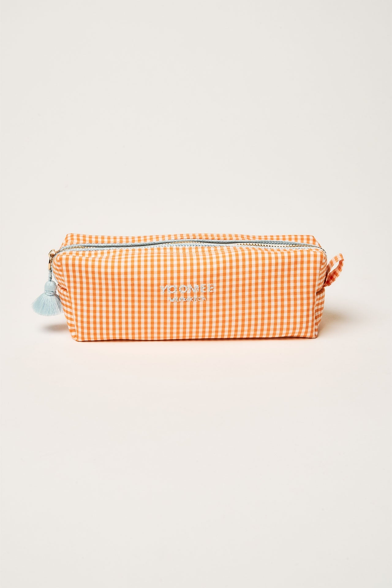 this colourful etui is perfectly sized for pens or brushes or your daily make up. it features unique cotton fabrics, a hand-embroidered logo and an intricate border along the zipper. it also has a cute little tassel on the zipper.