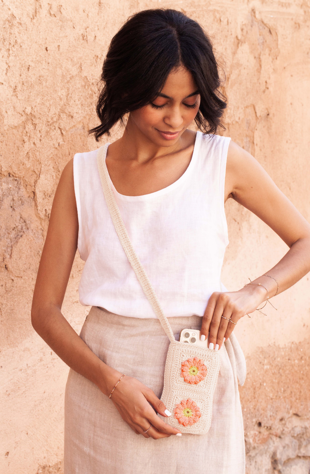 this WARDA phone case is knitted with the known granny square technique which we know from the 60s. the whole collection is a collaboration of two women. all the flowers are made by florence`s mother in zurich and the finishing is done by a female artisan in piemont. this collection is a delightful blend of style, nostalgia and sustainability.