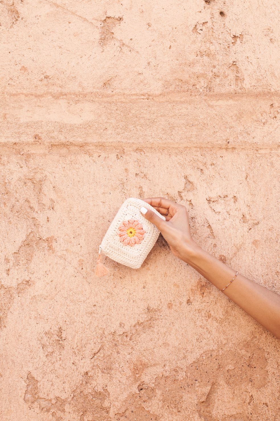 this WARDA wallet is knitted with the known granny square technique which we know from the 60s. the whole collection is a collaboration of two women. all the flowers are made by florence`s mother in zurich and the finishing is done by a female artisan in piemont. this collection is a delightful blend of style, nostalgia and sustainability.